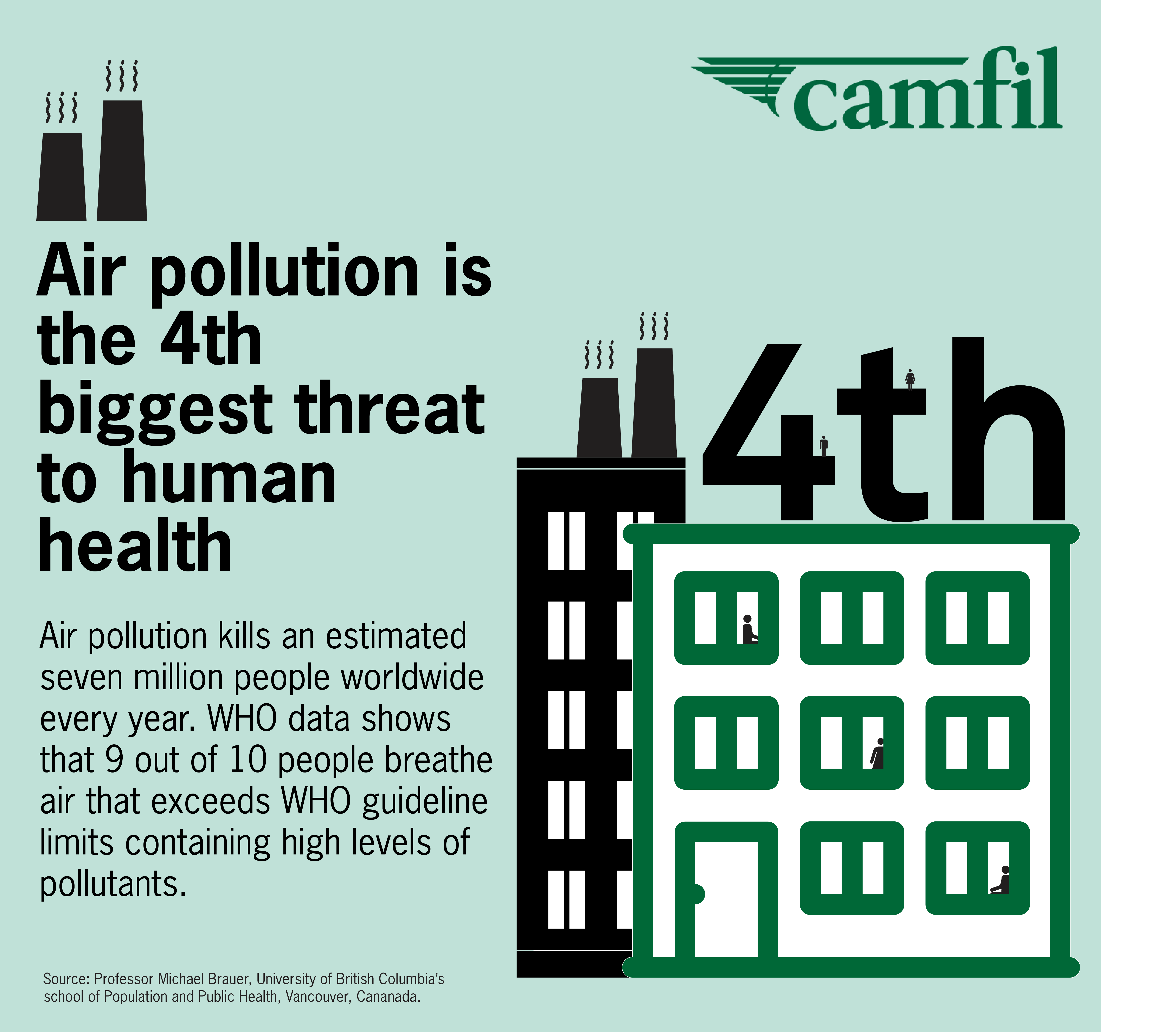 Camfil is in the vanguard of a growing international movement to reduce the negative health effects of polluted air. As a leader in clean air solutions, we actively inform and educate customers, decision-makers, and the general public about threatening air pollutants and the tangible benefits of effective air filtration and high indoor air quality.