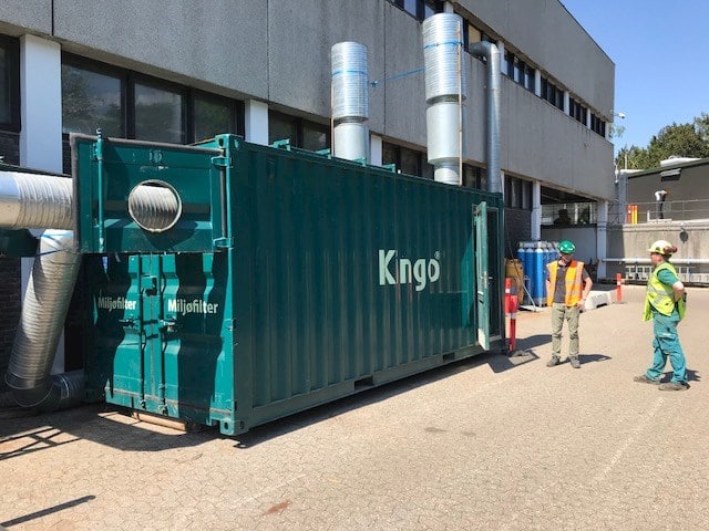 For at sikre det nødvendige undertryk samt filtrering af farligt støv valgte Kingo at anvende Camfils miljøsugere og modulsugere i nedrivningsprocessen. Camfils mobile miljøsuger blev indbygget i en 20’ container med en kapacitet på 2 x 10.000 m³/h og flere modulsugere, der hver har en kapacitet på 4.000 m³/h, blev placeret på strategiske steder.