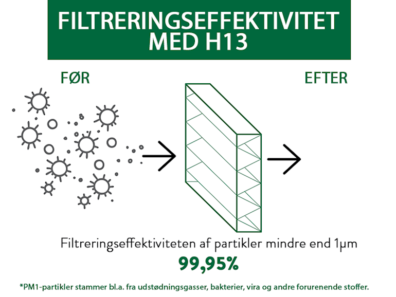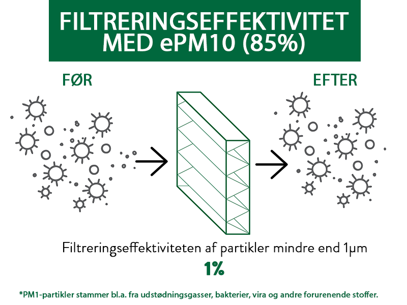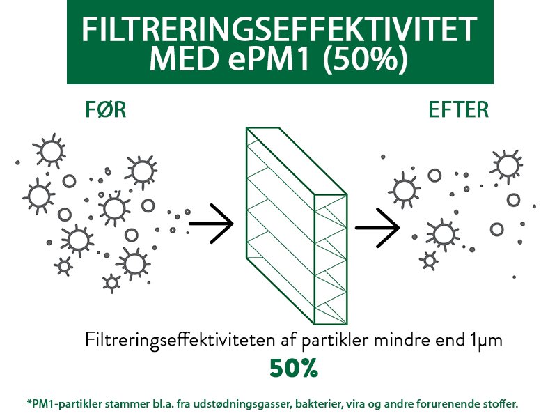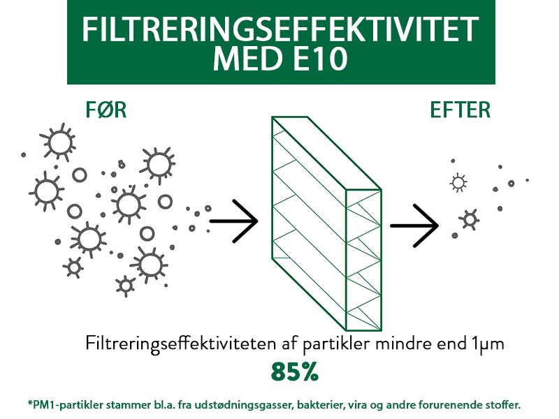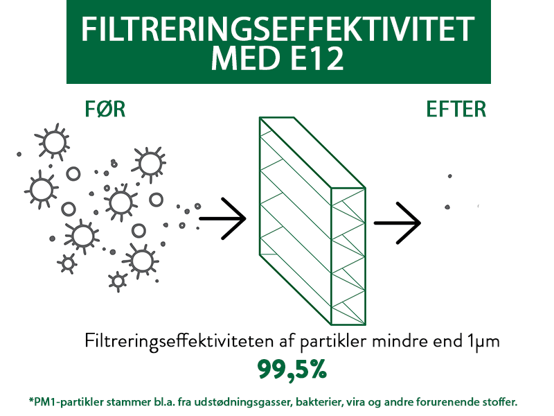 Effektiviteten af højtydende luftfiltre (HEPA-filtre) måles ved MPPS (mest penetrerende partikelstørrelse), hvilket betyder, at dette er filterets laveste effektivitet. Ved mindre eller større partikler, vil filteret fungere endnu bedre. MPPS er typisk mellem 0,1 til 0,2 mikrometer i størrelse. Bakterier og vira er ofte mindre end det men binder sig typisk til større partikler. Det er også vigtigt at forstå, at luftfiltre ikke aktivt dræber levende organismer. De fanger og fastholder dem i filtermaterialet. Når virusset er fanget, forbliver det i luftfilteret og tørrer til sidst ud og dør (kaldet inaktiv). Undersøgelser af COVID-19-virus indikerer, at virusset ikke overlever længere end tre dage på åbne overflader. Diagrammerne nedenfor viser filtreringseffektiviteten for forskellige filtre, når det gælder de mindste partikler, PM1, som f.eks. udstødningsgasser, vira og bakterier.