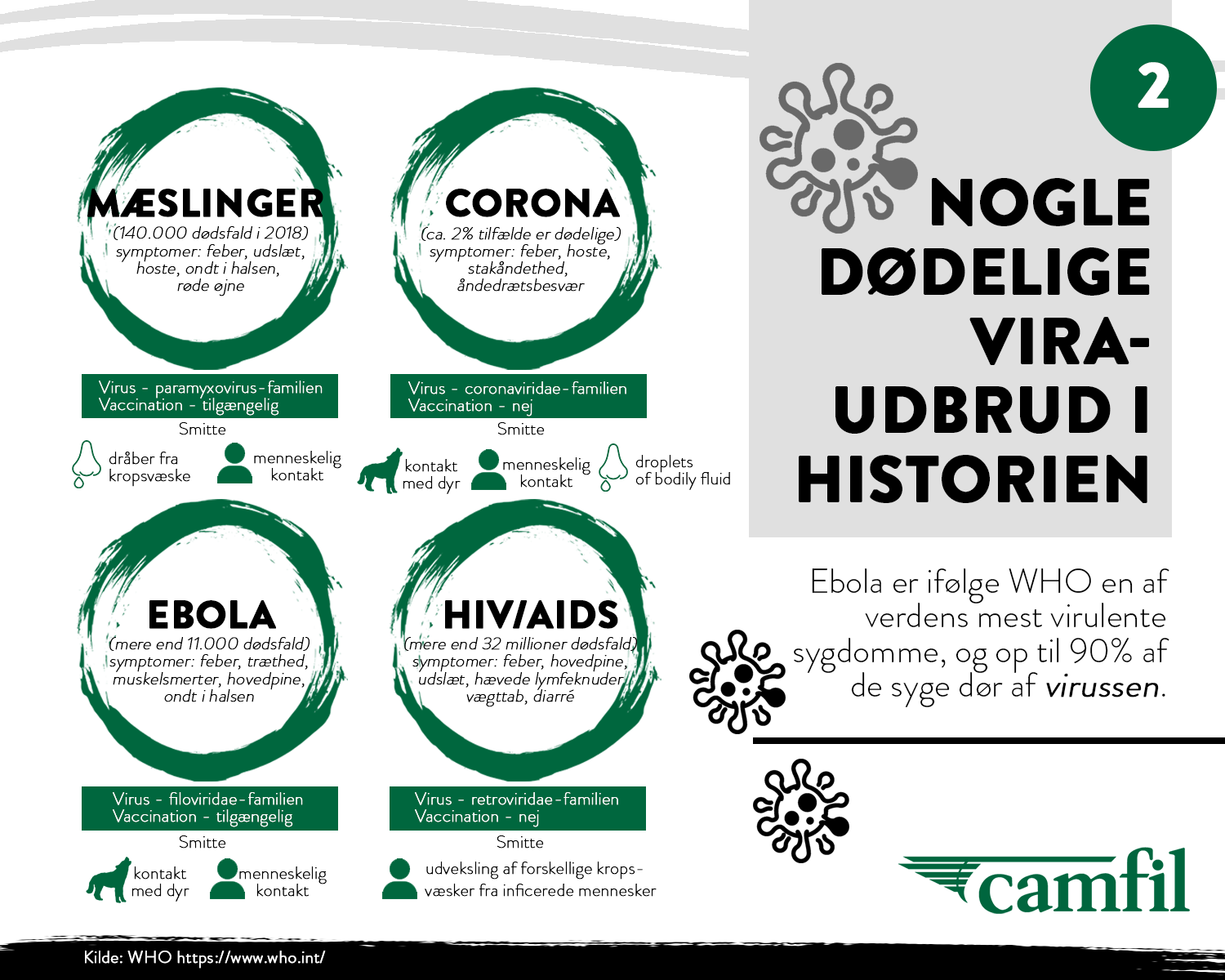 At opretholde et højt hygiejneniveau og dække munden med en maske er gode måder at beskytte sig på. Men er det nok? Der findes vaccinationer for nogle vira og ikke for andre. De vira, hvor der ikke er fundet en vaccine, er vanskelige, og i kombination med høj infektionsfare og dødelighed kan disse blive alvorlige pandemier og meget svære at håndtere. WHO (Verdenssundhedsorganisationen) har varslet om alvorlige udbrud mange gange i historien. I februar 2003 slog SARS (Severe Acute respiratory Syndrome) ca. 1 ud af 10 smittede mennesker ihjel. Og over en periode på 40 år har Ebola virus slået 25% til 90% af de smittede ihjel. Novel Coronavirus, der først blev opdaget i 2019, har nu mere end 40.000 rapporterede tilfælde - og tallet vokser.