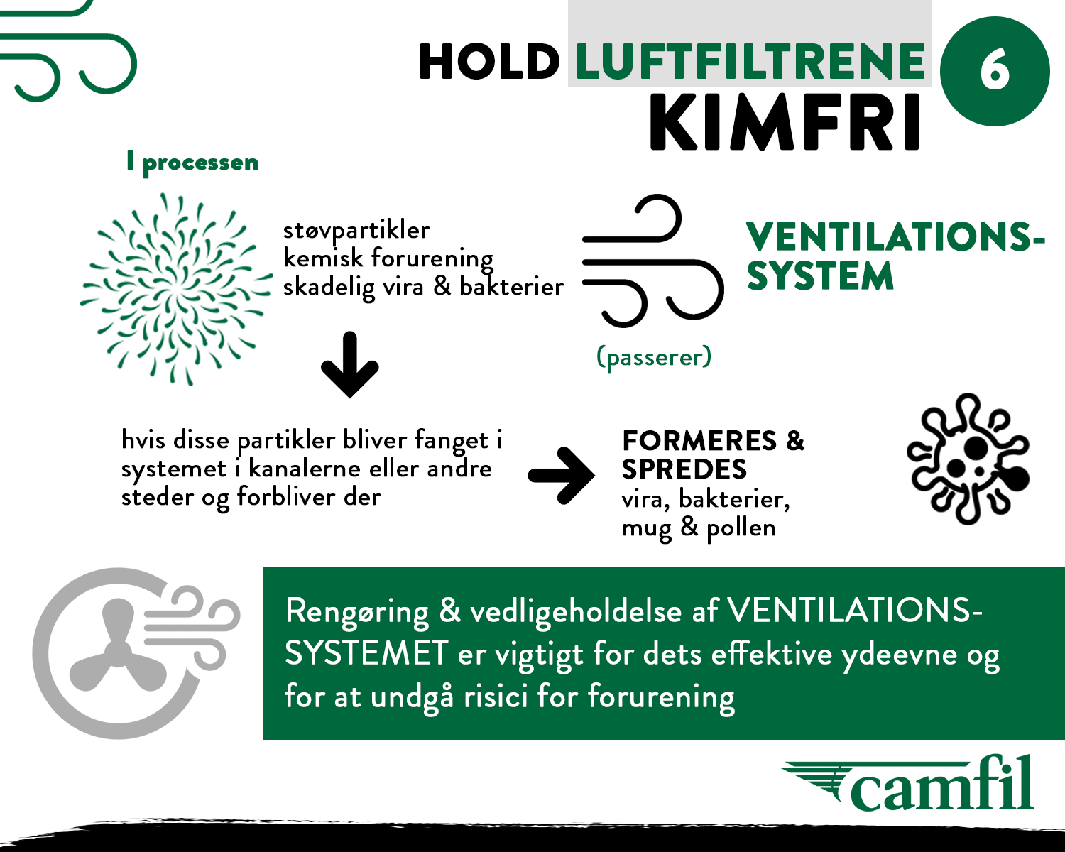I HVAC-anlæg fjerner ventilationssystemet støvpartikler, kemiske forurenende stoffer samt skadelige vira og bakterier sammen med andre giftige partikler. Men de må jo havne et sted... En del af disse stoffer bliver fanget i filtre, kanaler eller andre steder - og forbliver der. Dette er ikke godt og kan medføre alvorlige sundhedsrisici. For at undgå ophobning er rengøring og vedligeholdelse af ventilationssystemet vigtigt. Et rent system med gode hygiejniske forhold vil bidrage til at fjerne giftige partikler fra luften. I tilfælde af et udbrud bør det første skridt være at tjekke, om filtre er gamle og har opsamlet meget snavs (organisk materiale, der kan understøtte mug).