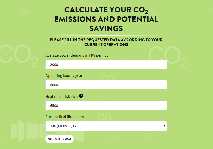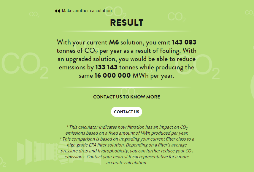 In der unten aufgeführten Tabelle ist angegeben, dass durch die Aufrüstung von einem Standard-M6-Filter auf einen hydrophoben E12-Filter bis zu 35000 Tonnen CO2-Emissionen pro Jahr eingespart werden können. Dies entspricht einer Reduzierung der Gesamtemissionen pro erzeugter Megawattstunde um 5 %. Es ist so, als würden sich 18.000 Autos weniger auf den Straßen bewegen.