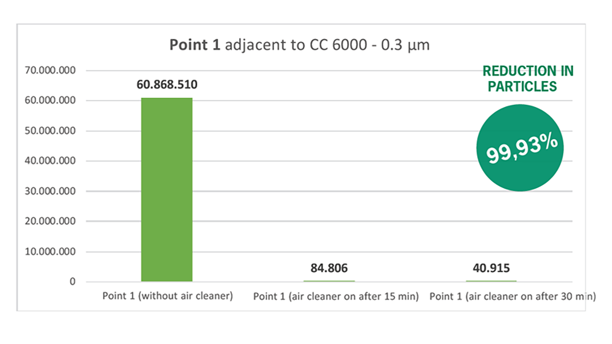 Die durchgeführten Partikelmessungen zeigen eine Reduzierung von 99,93% auf 99,99% der Feinstaubpartikel ab 0,3µm nach nur 30 Minuten nach dem Einschalten des Luftreinigers CC 6000 ProSafe mit F7 + H14-Filterung. Die Entfernung der Partikel bestimmt auch die Beseitigung mikrobiologischer Verunreinigungen und damit die Verlängerung der Haltbarkeitsdauer des Produkts.