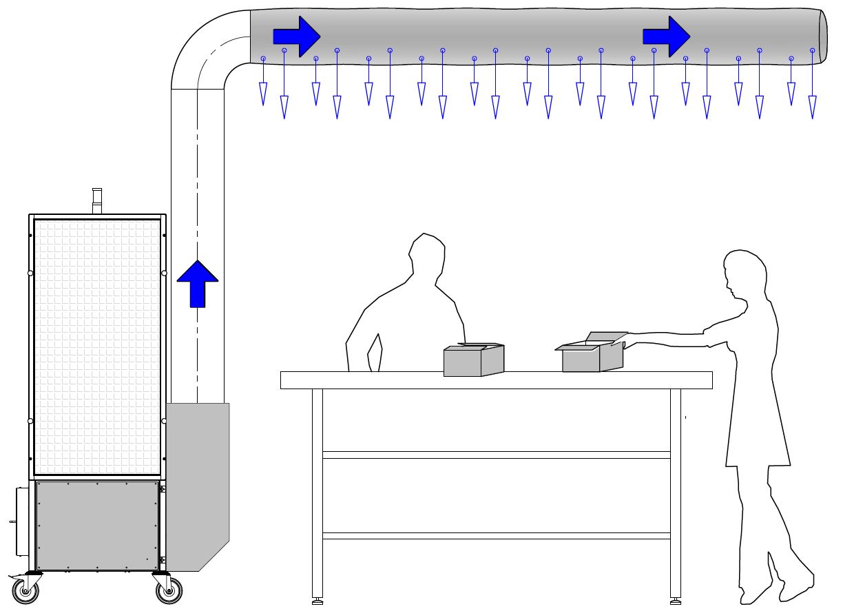 Die von Camfil vorgeschlagene Lösung ist der Luftreiniger CC 6000 Prosafe mit F7 + H14-Filterung und Diffusion mit doppelter Kanalisierung durch Gewebehülsen (konform mit der FDA-Verordnung - Food and Drug Administration - 21 CFR), die für die Lebensmittelumgebung über dem Verpackungsbereich geeignet sind.