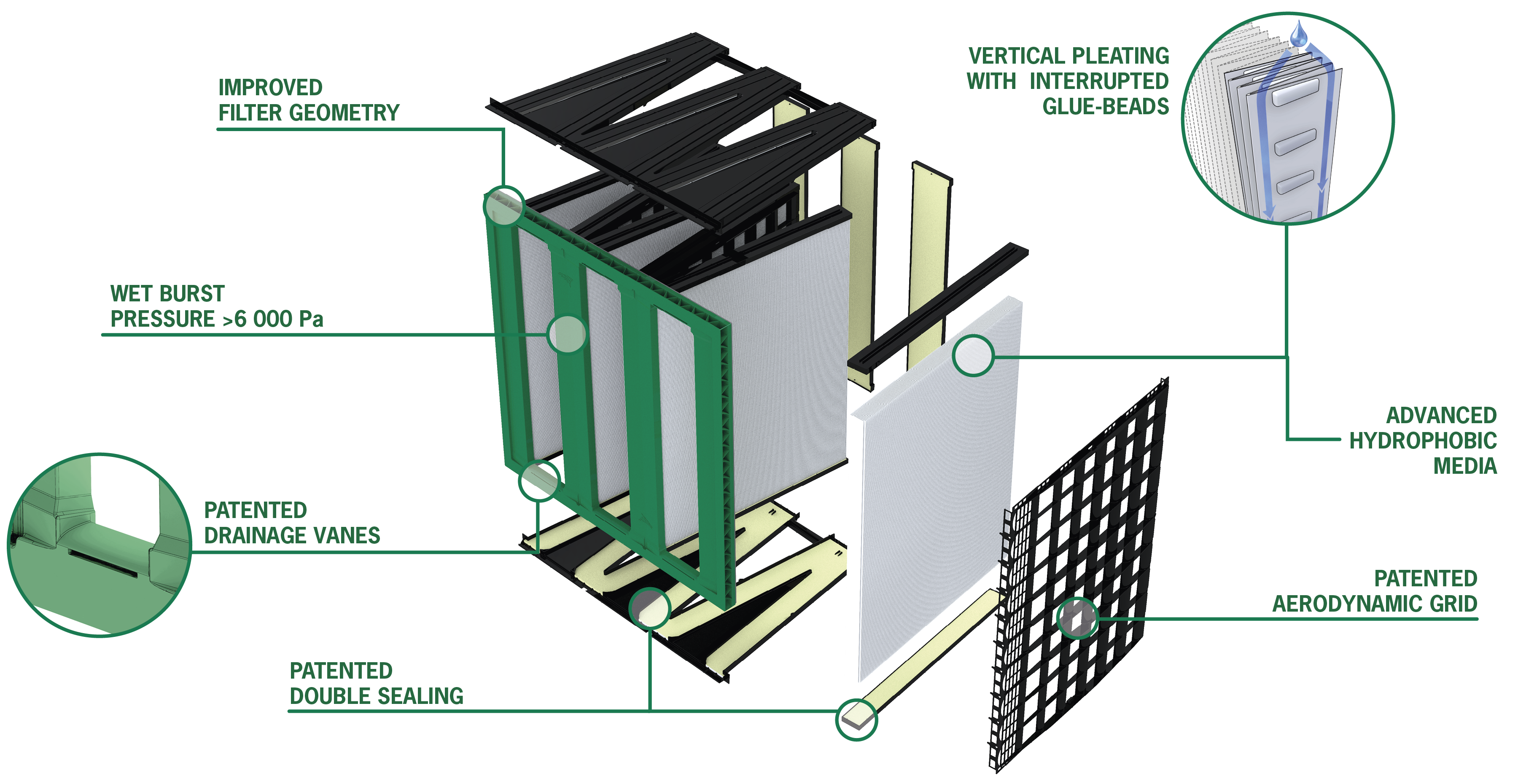 Advanced hydrophobic media and our patent pending double sealed construction eliminates water bypass and dissolved salts from entering your gas turbine. Fouling and corrosion are therefore no longer a risk, eliminating the risk of unplanned downtime for engine maintenance.
