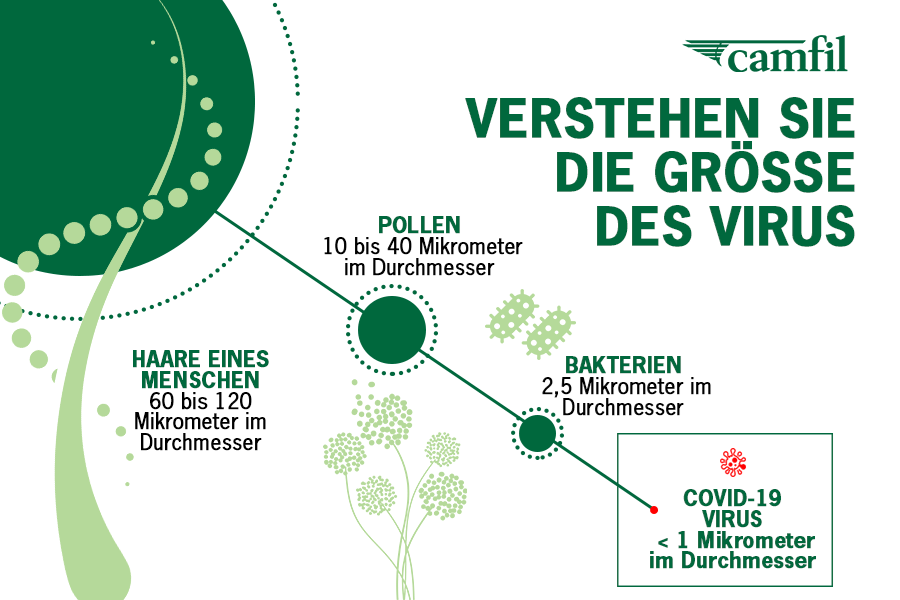 Die Größe der Partikel, die aus der Innenraumumgebung herausgefiltert werden müssen, gibt die Auswahl oder Optionen der Effizienz der Luftfiltrationslösung vor. Pollen oder Bakterien erscheinen im Vergleich zum COVID-19-Virus beispielsweise riesig, sodass ein Schutz, der für saisonale Allergien ausreichend ist, möglicherweise ungenügend ist im Kampf gegen schädliche Krankheitserreger, wie den COVID-19-Virus. Der weitere Vergleich mit dem menschlichen Haar, das einen Durchmesser von 60 bis 120 Mikrometer hat, bietet ein gutes Verständnis darüber, wie klein der COVID-19-Virus ist.