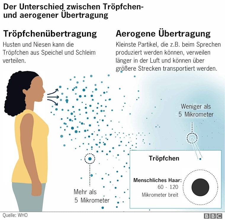 In einer wissenschaftlichen Debatte hat die WHO bestätigt, dass im Fall von COVID-19 eine Übertragung über die Luft in überfüllten, geschlossenen oder schlecht belüfteten Umgebungen nicht ausgeschlossen werden kann. Wissenschaftler weltweit suchen nach weiteren Nachweisen, da sich dies auf die Richtlinien für überfüllte Innenräume auswirken könnte. Bisher hat die WHO Studien und Nachweise anerkannt, die die Übertragung von COVID-19 von symptomatischen Personen auf andere Personen in direktem Kontakt über Tröpfchen aus den Atemwegen beschreiben. Sowohl über den direkten Kontakt mit der Person als auch über engen Kontakt mit kontaminierten Objekten und Oberflächen.
