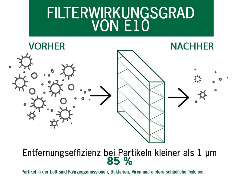 Die Effizienz von Schwebstoff- oder HEPA-Filtern (High Performance Air Filter) wird in MPPS (Most Penetrating Particle Size) also der Partikelgröße mit der höchsten Penetration gemessen, was der geringsten Effizienz des Filters entspricht. Für kleinere oder größere Partikel ist die Leistung dieses Filters sogar noch höher. Die MPPS liegt in der Regel zwischen 0,1 – 0,2 Mikrometer in Größe. Bakterien und Viren sind zwar in der Regel kleiner als das, hängen sich aber größeren Partikeln an. Es ist auch wichtig zu verstehen, dass Luftfilter aktiv lebende Organismen nicht abtöten. Filter dienen lediglich für das Erfassen und die Rückhaltung innerhalb der Filtermatrix. Nachdem der Virus erfasst wurde, verbleibt er im Luftfilter, wo er letztendlich austrocknet und abstirbt (auch als inaktiver Virus bezeichnet). Studien zum COVID-19-Virus deuten darauf hin, dass der Virus nicht länger als drei Tage auf offenen Oberflächen überleben kann. Die nachstehenden Diagramme erklären die Effizienz der ausgewählten Luftfiltration im Kampf gegen Submikronpartikel, wie Kraftfahrzeugemissionen, Bakterien, Viren und andere Schadstoffe.