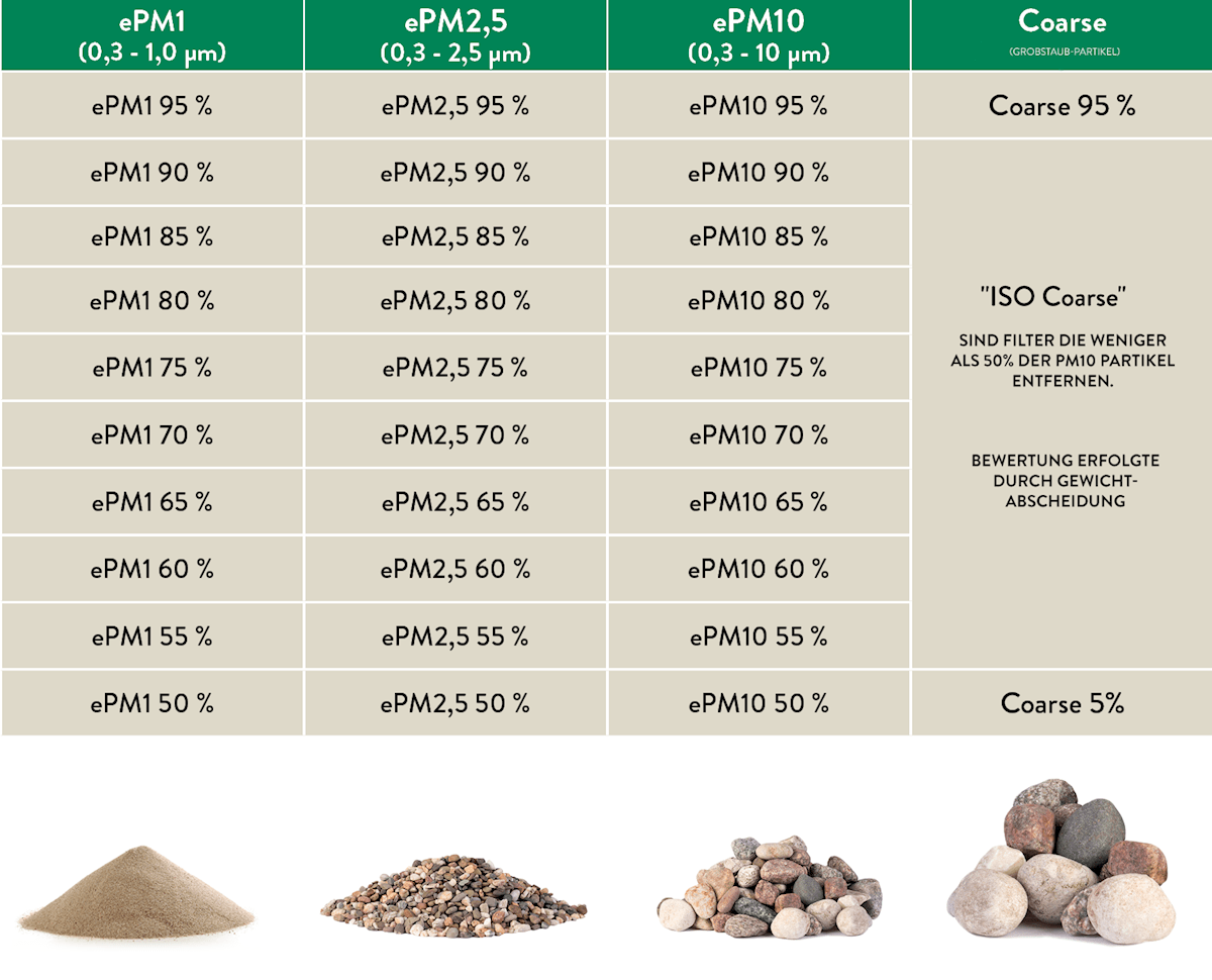 Damit ein Filter in eine dieser drei PM-Klassen kategorisiert werden kann, ist ein Abscheidegrad von mindestens 50 % der entsprechenden Partikelfraktion erforderlich. Wenn ein Filter in keiner der PM-Fraktionen einen Abscheidegrade von 50 % erzielt, erhält der Filter eine Filterklasse in der Grobstaubfilter (Coarse). Der Grad der Filtration ist ein Durchschnitt mit und ohne statische Aufladung. Dem Filter wird auch ein Prozentsatz hinsichtlich der PM-Gruppe zugewiesen, in die der Filter eingestuft wird. Dieser Prozentsatz wird auf 5 % abgerundet. Unten sehen Sie die verschiedenen Filterklassen, denen ein Filter zugewiesen werden kann (30 verschiedene Klassen und Coarse).