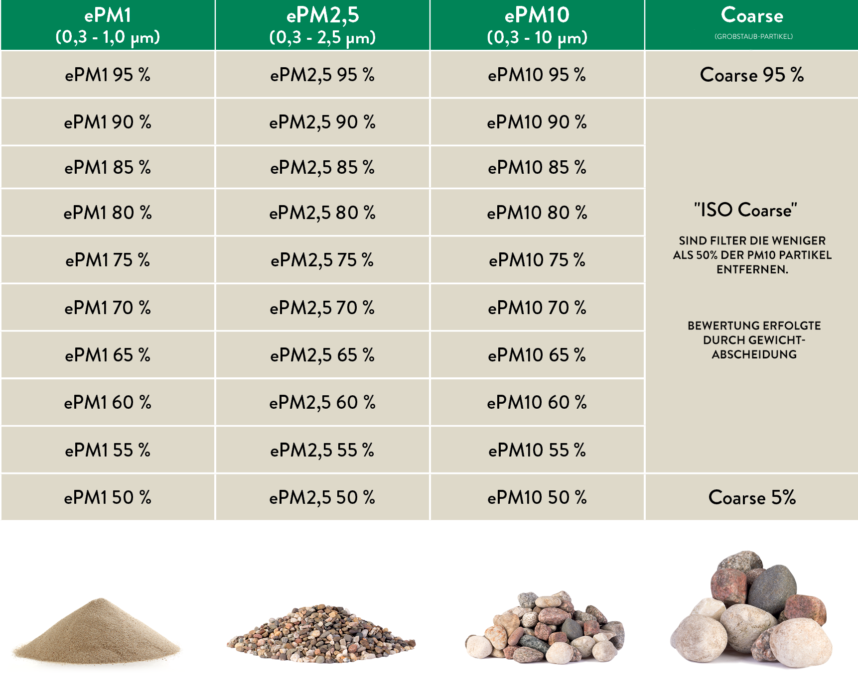 Damit ein Filter in eine dieser drei PM-Klassen kategorisiert werden kann, ist ein Abscheidegrad von mindestens 50 % der entsprechenden Partikelfraktion erforderlich. Wenn ein Filter in keiner der PM-Fraktionen einen Abscheidegrade von 50 % erzielt, erhält der Filter eine Filterklasse in der Grobstaubfilter (Coarse). Der Grad der Filtration ist ein Durchschnitt mit und ohne statische Aufladung. Dem Filter wird auch ein Prozentsatz hinsichtlich der PM-Gruppe zugewiesen, in die der Filter eingestuft wird. Dieser Prozentsatz wird auf 5 % abgerundet. Unten sehen Sie die verschiedenen Filterklassen, denen ein Filter zugewiesen werden kann (30 verschiedene Klassen und Coarse).