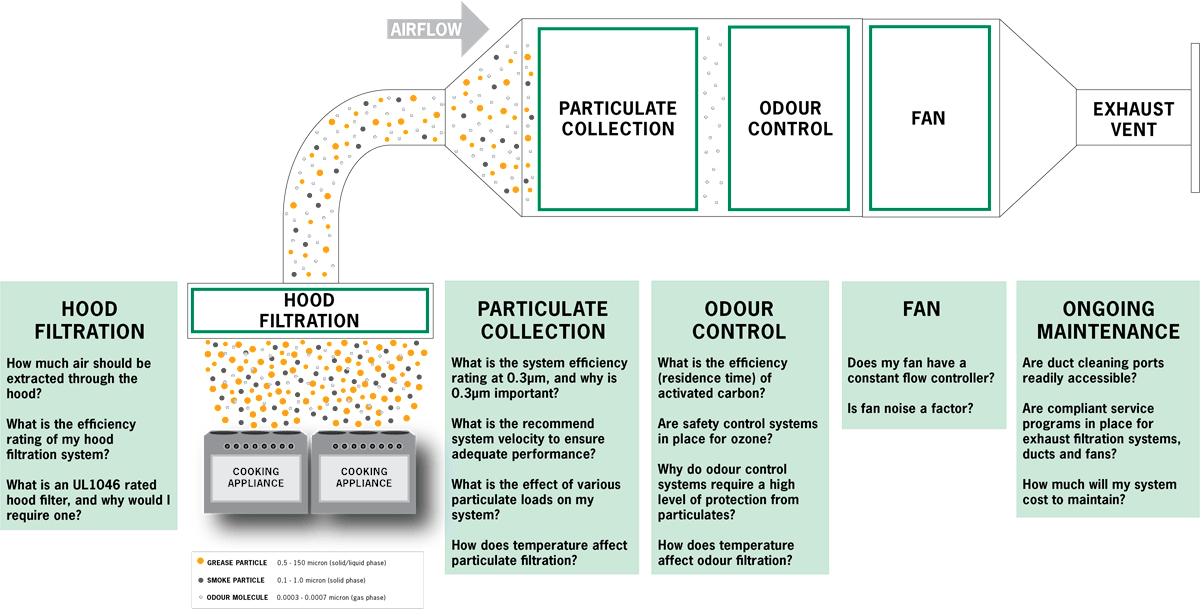 Ideally, a kitchen exhaust treatment system should be designed to remove particulates (such as grease, oil and smoke) to a high level before removing the odour. Effective odour-removal technologies will provide greater performance and endurance when protected from grease, oil and smoke particulates. These contaminations will overload, impede and reduce the efficiency of odour-control systems, rendering their odour removal properties as ineffective.