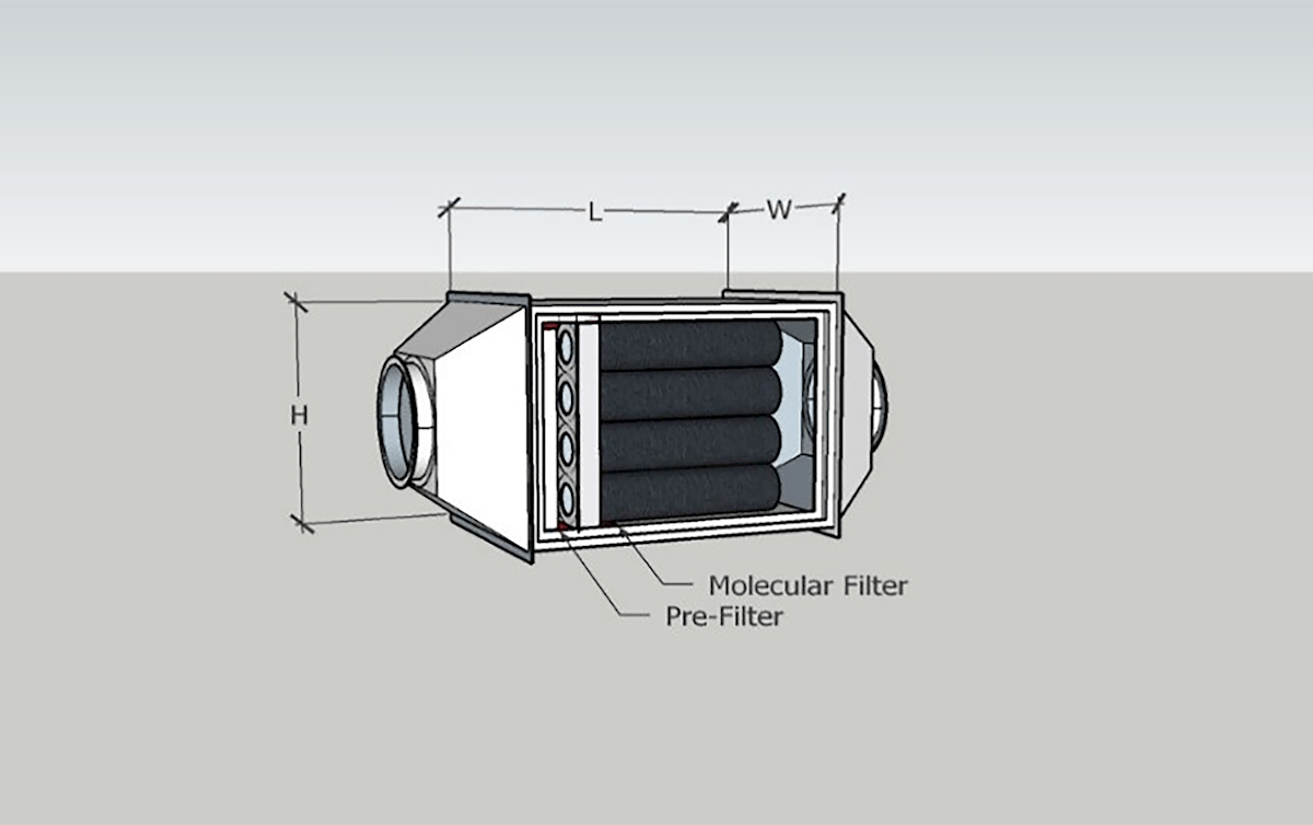 3D draft of the solution where exhaust unit is equipped with 30/30 panel pre-filter and CamCarb CG 3500 molecular filter.