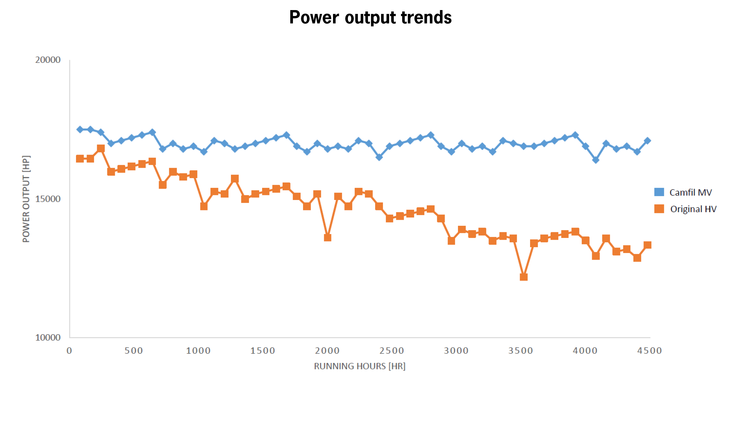 Initial pressure drop was reduced by more than 50% with the new filtration system, from 996 Pa down to 478 Pa. On the first day of installation and after fire up, the upgraded engine gained around 1000 HP, or approximately 6% more, as compared to the higher velocity system.