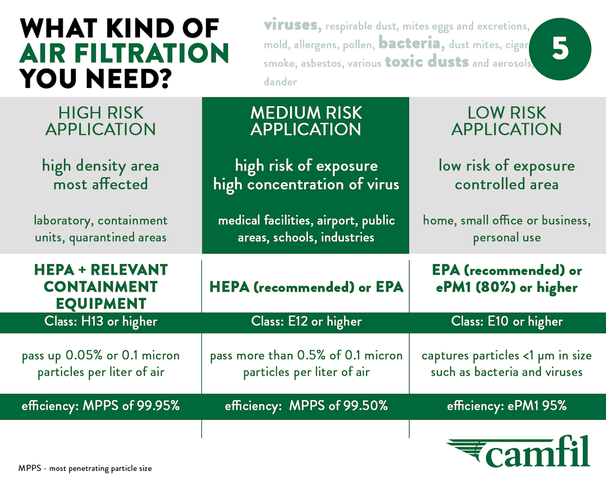 The efficiency of HEPA filters is measured at MPPS (most penetrating particle size) that means this is the lowest efficiency of the filter. For smaller or larger particles that filter will perform even better. MPPS is typically between 0,1-0,2 micrometer in size. Bacteria and viruses are often smaller than that but typically attach themselves to larger particles. It’s also important to understand HEPA filters do not actively kill living organisms. They capture and hold them within the matrix of the filter.
