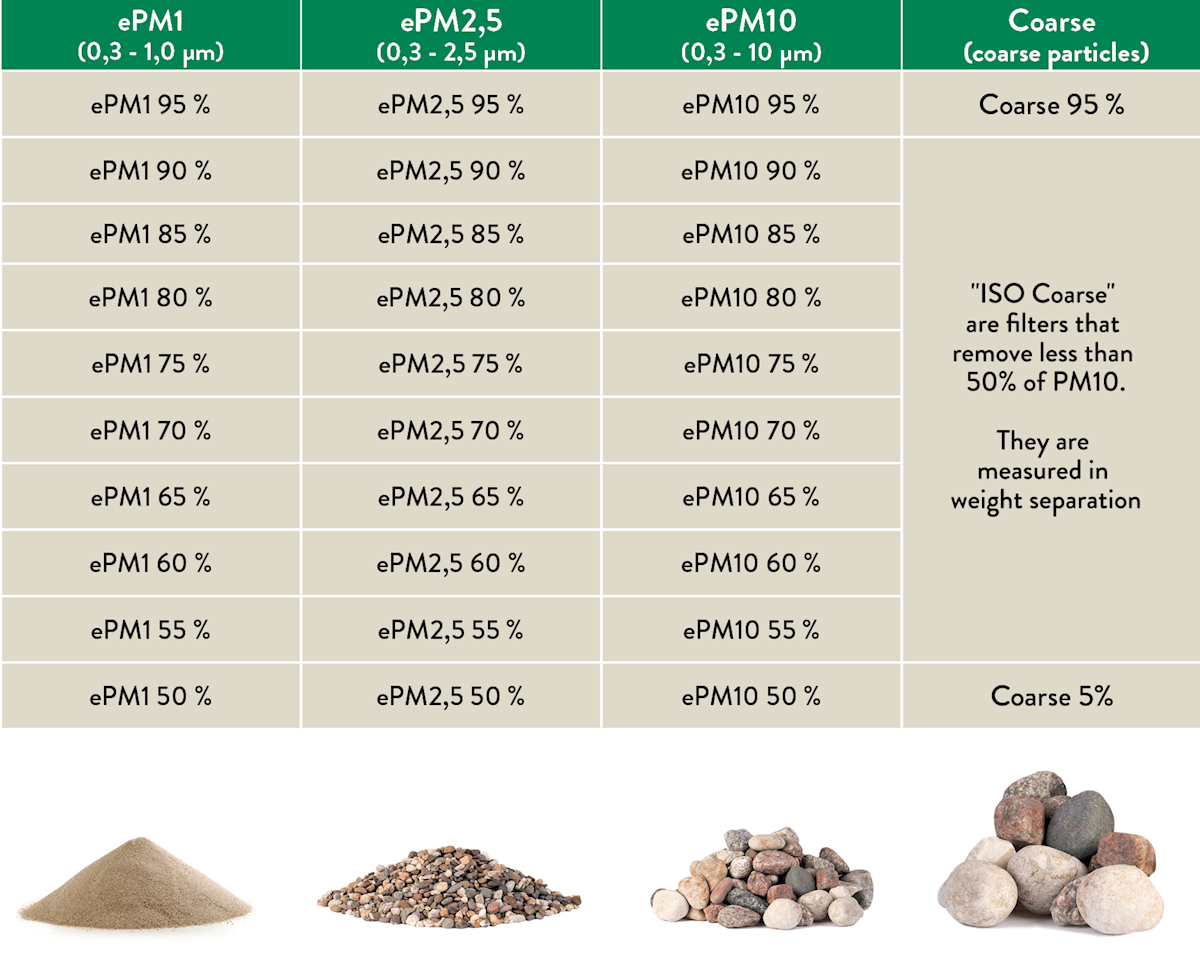 For a filter to be classified in any of the three PM classes, a degree of separation of at least 50% of the particle fraction is required. If a filter does not pass 50% separation in any of the PM fractions, the filter gets a filter class in the group Coarse (coarse filter). The degree of filtration is an average with and without static charge. The filter is also assigned a percentage linked to the PM group within which the filter can classify itself. The percentage is rounded down to an even 5%. Below are the different filter classes that a filter can be assigned (30 different classes and Coarse).