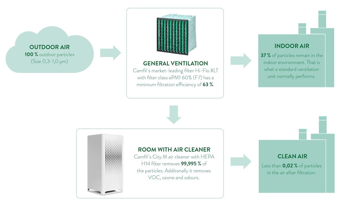 We spend up to 90% of our time indoors, which makes clean air one of the most important priorities in our workplace. It is not only the outdoor air that affects the indoor environment. We greatly influence it ourselves by using chemicals, chemical-based cleaning agents, candles, how often we clean, but also things like plants and textiles have an impact on the air quality. The droplets secreted when we sneeze, and cough is not something that the filters in the ventilation can prevent and filtration depends on many other factors. To avoid the spread of bacteria and viruses in the area, Camfil recommends installing air purifiers.