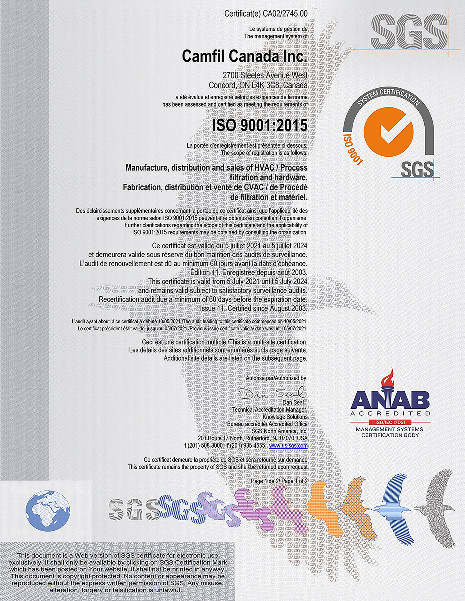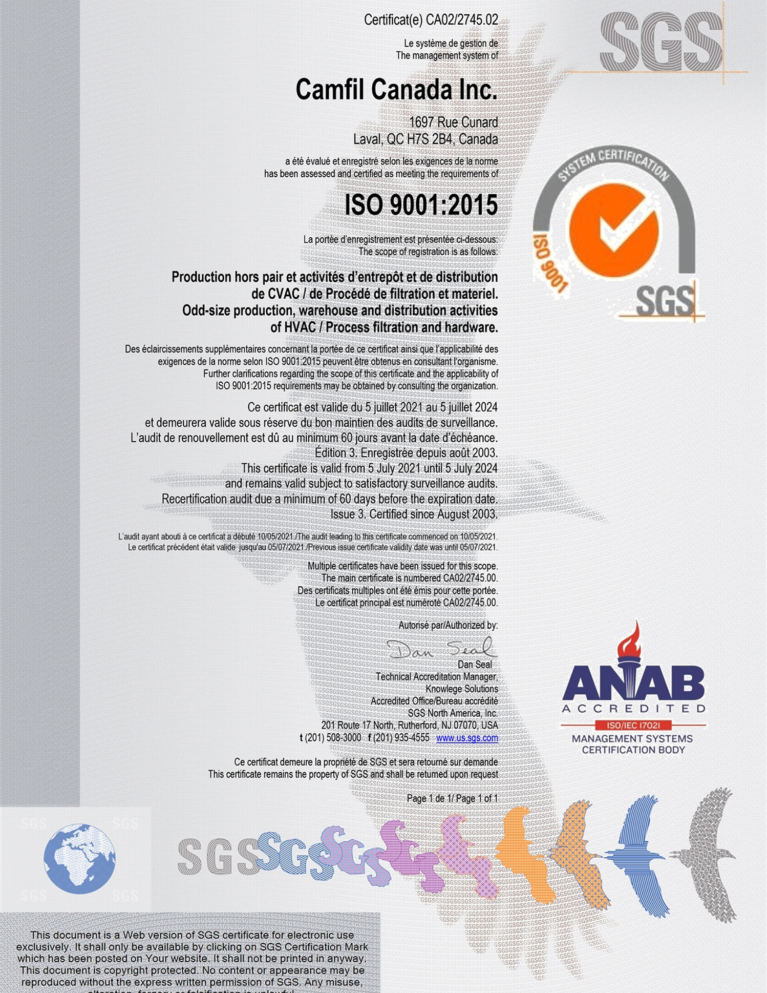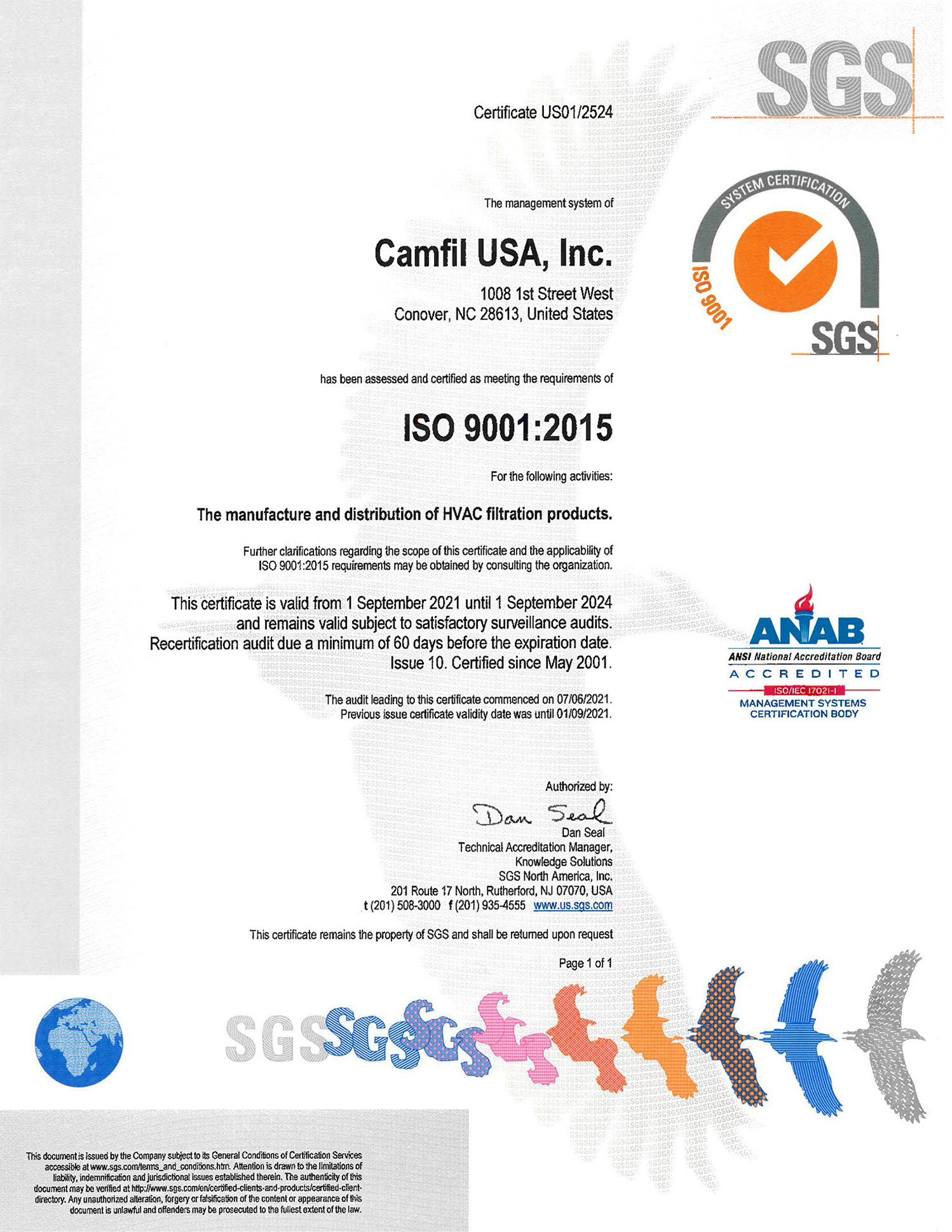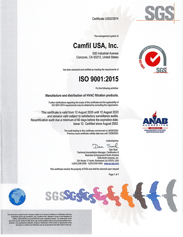 ISO 9001:2015 certifications for Camfil manufacturing facilities