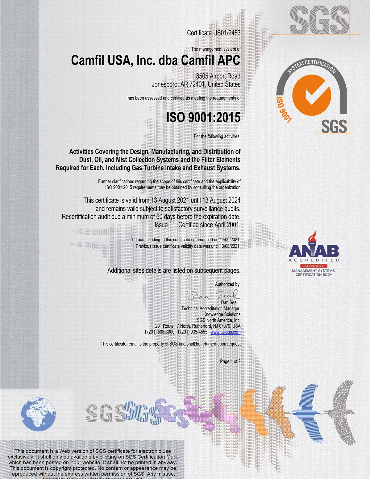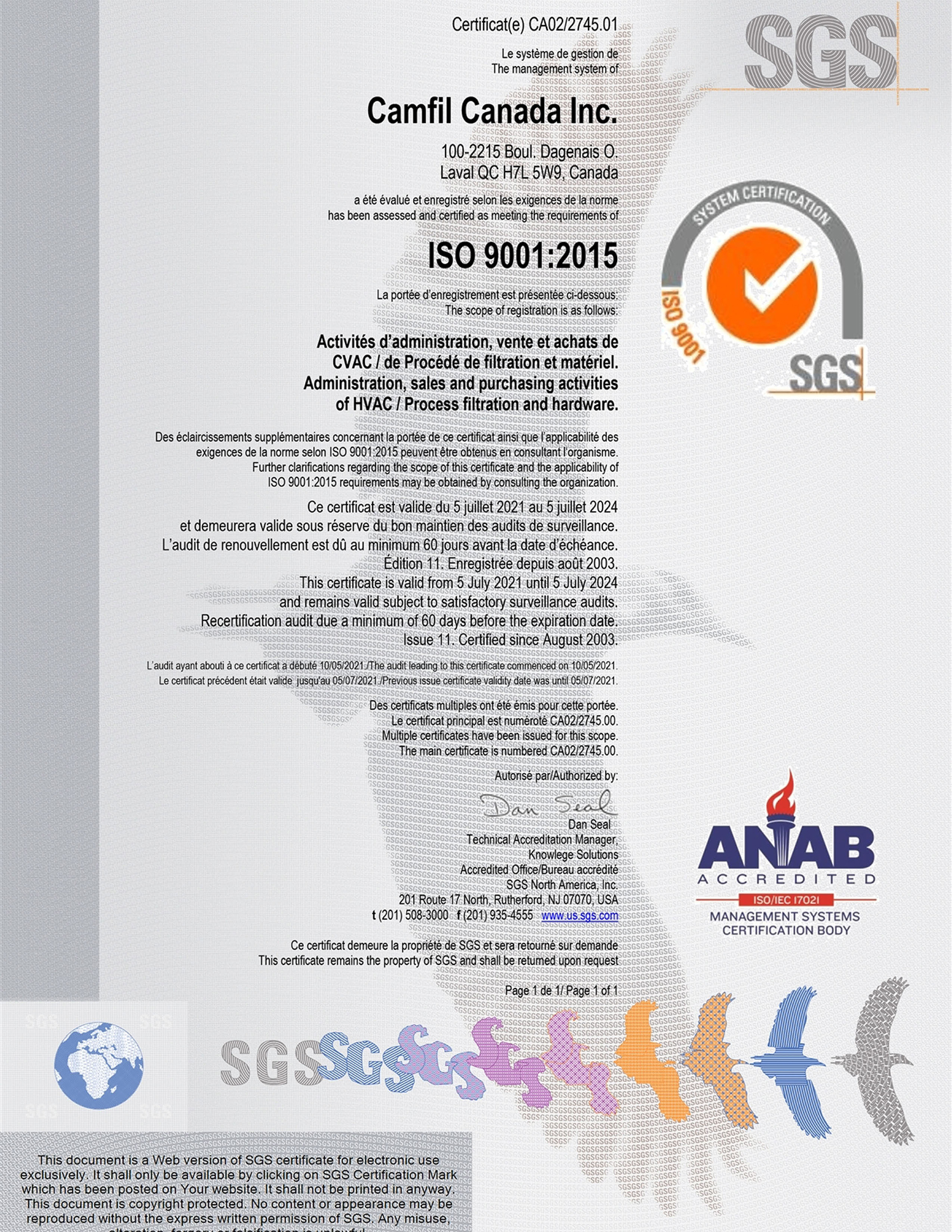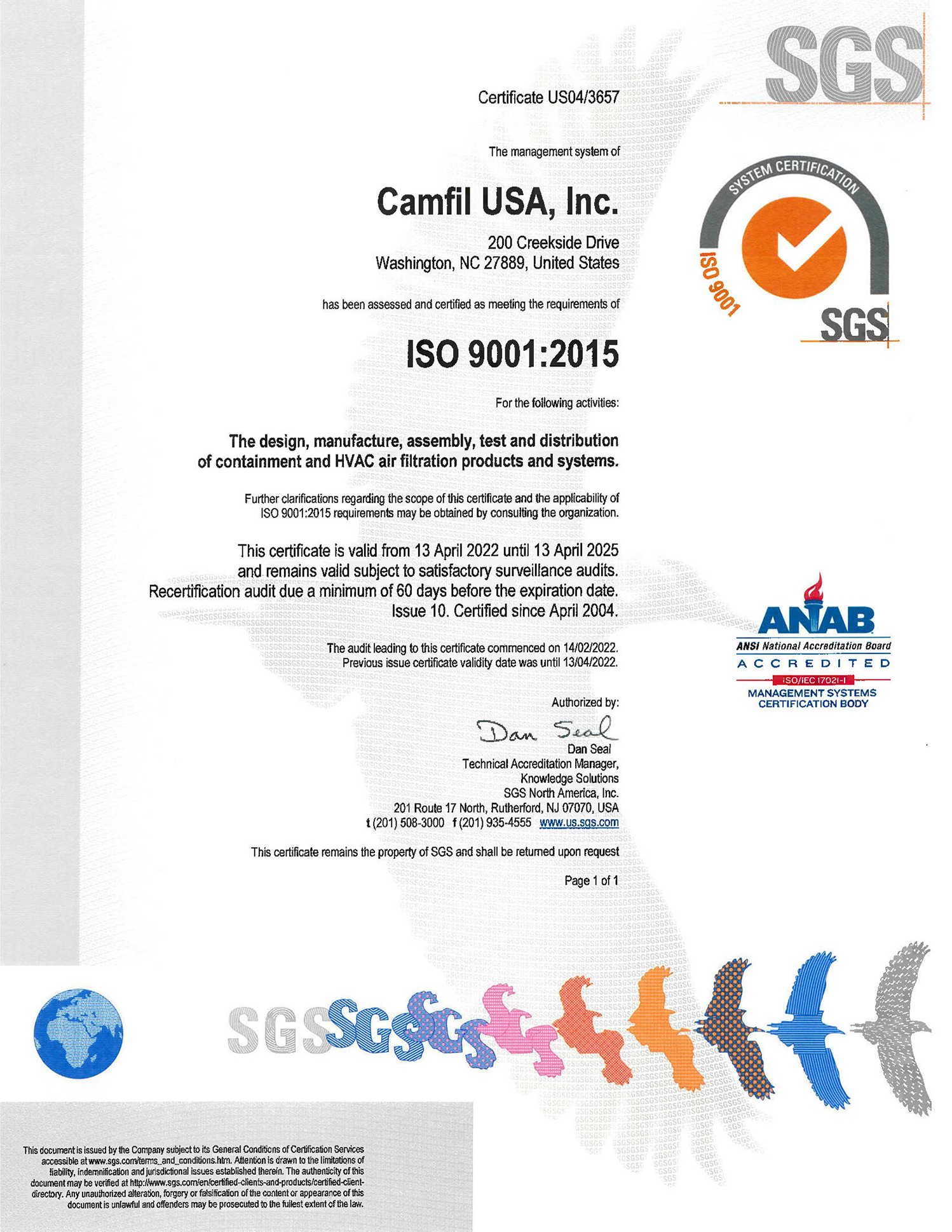 ISO 9001:2015 certifications for Camfil manufacturing facilities