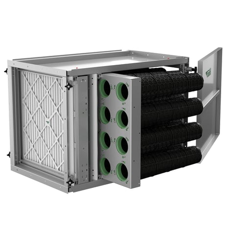 Side-access housing for CamCarb cylindrical adsorbent filters for moderate to high gas/vapor load in make-up, recirculation, and exhaust applications.
