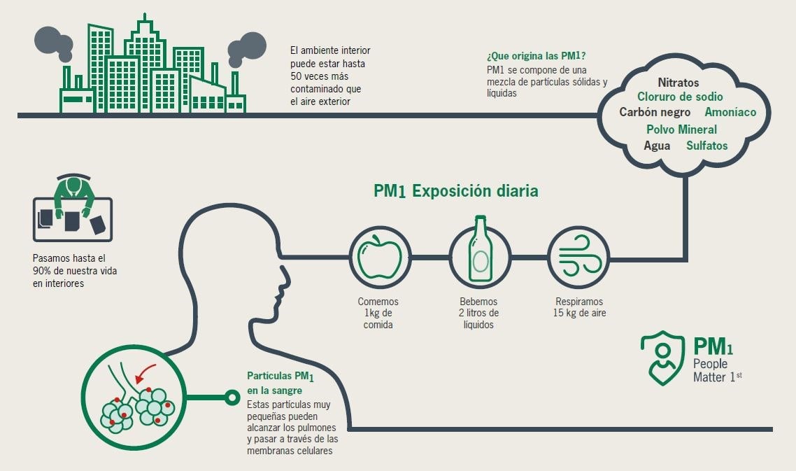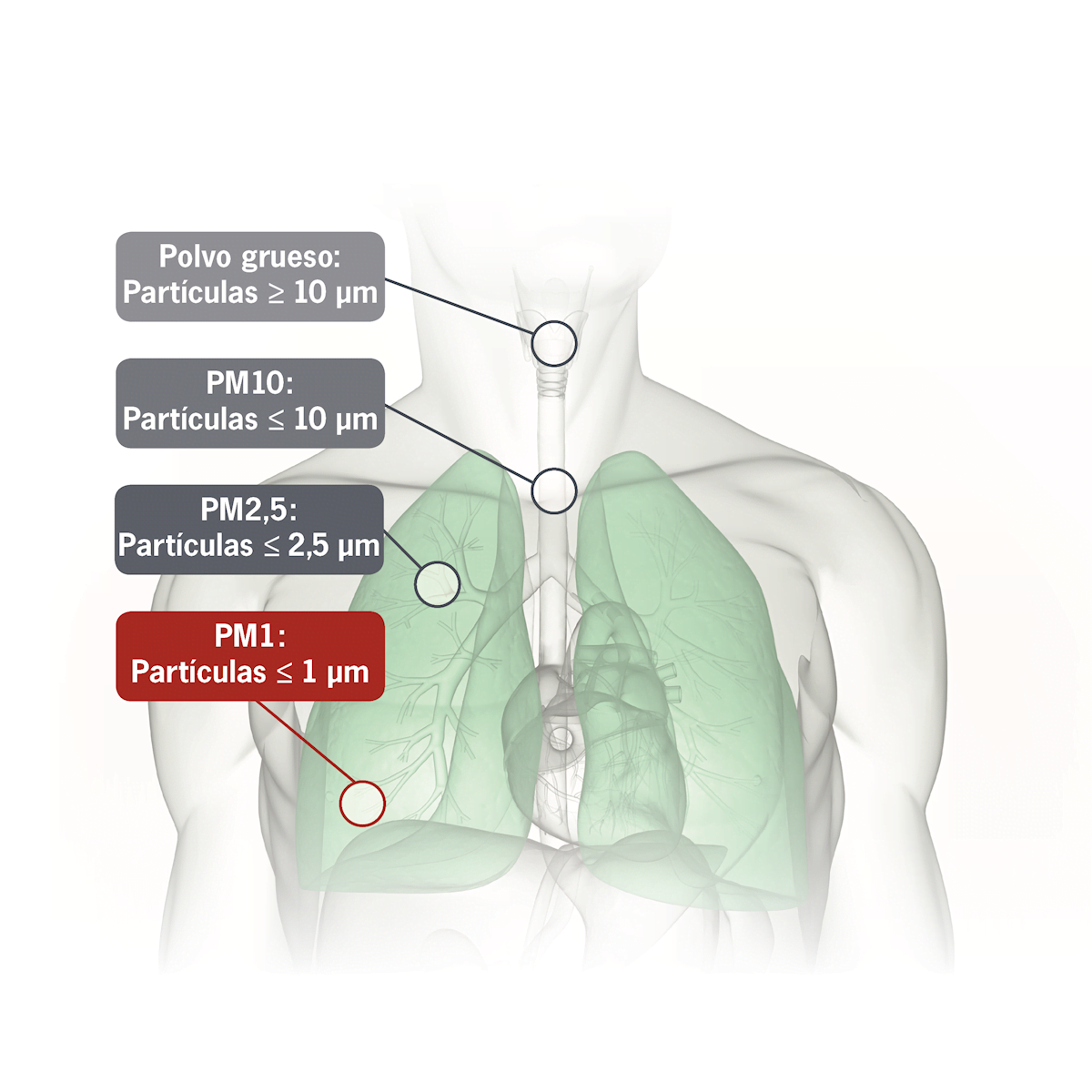 En el interior, estamos expuestos a una gran cantidad de partículas y contaminantes que afectan directamente a nuestra salud. Si el aire de suministro no se filtra de forma eficiente, se corre el riesgo de añadir un número importante de partículas nocivas al aire interior. Estas partículas entran en nuestro sistema respiratorio y pueden continuar hacia nuestro sistema cardiovascular.