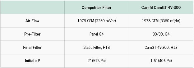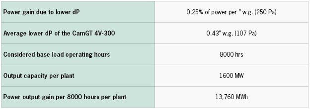 Los robustos elementos estructurales del CamGT 4V-300 lo convierten en un filtro superior desde el punto de vista acústico. Además, en la Tabla 1 se muestra cómo al cambiar al CamGT 4V-300, la pérdida de carga (dP) inicial mejoró un 14%. En general, una (dP) de 25mm (250 Pa) afecta negativamente a la salida de potencia del ciclo combinado en un 0,25 % cuando funciona a plena capacidad.