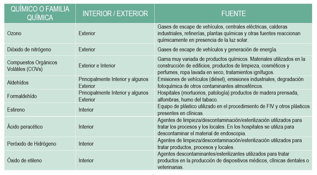 La tabla muestra las fuentes de contaminantes en el interior y las sustancias químicas.