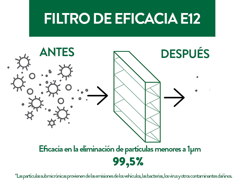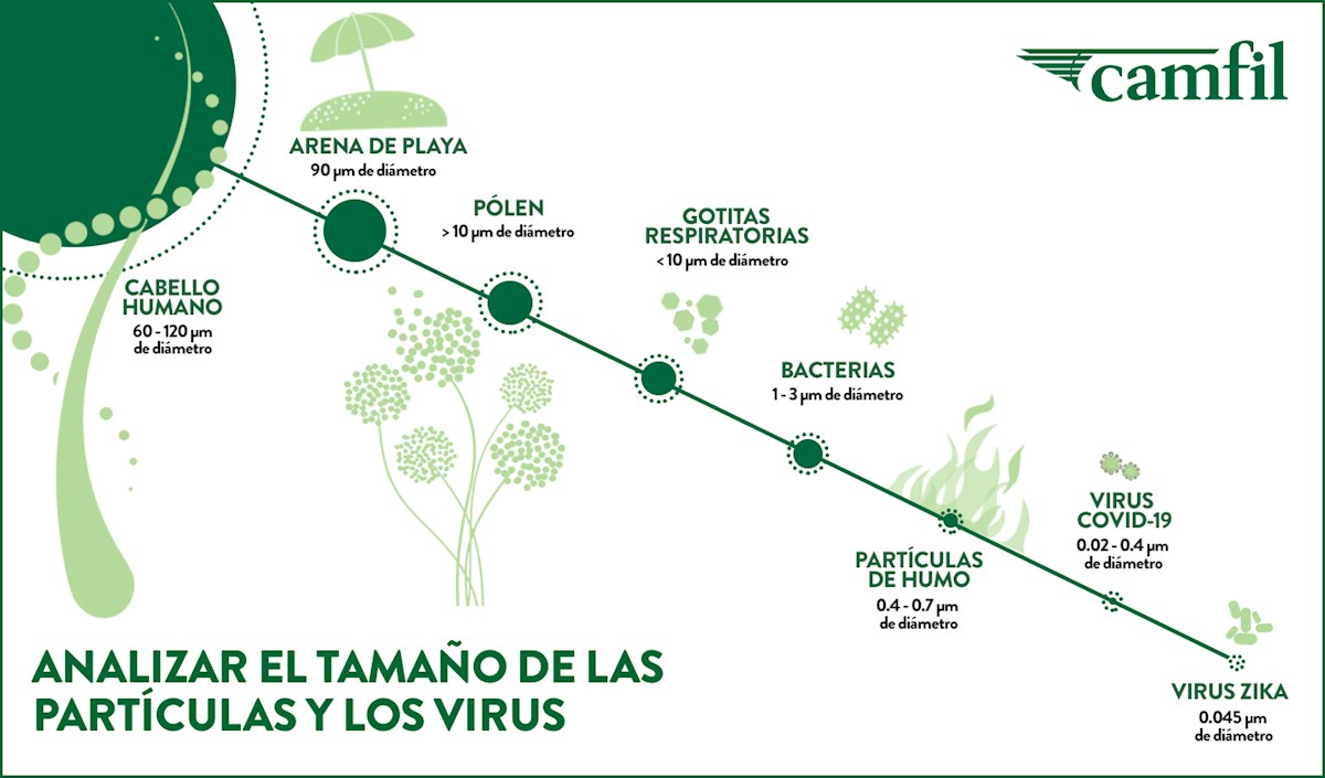 Los estudios sobre la COVID-19 indican que el virus no sobrevive más de 3 días en superficies abiertas. Los siguientes diagramas explicarán la eficacia del filtro de aire seleccionado en la lucha contra las partículas submicrónicas como las emisiones de los vehículos, las bacterias, los virus y otros contaminantes dañinos.
