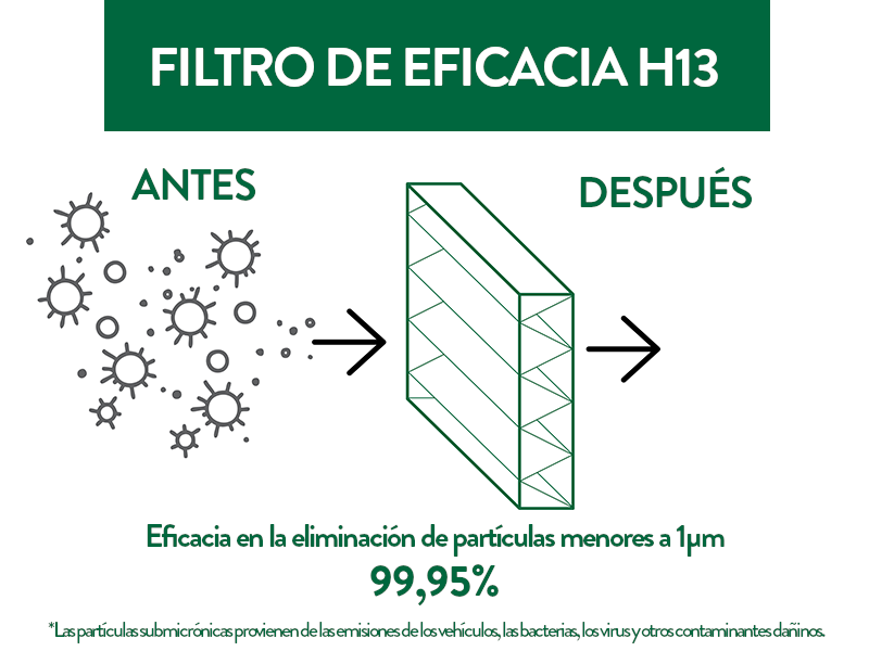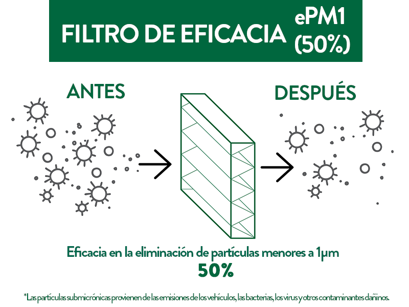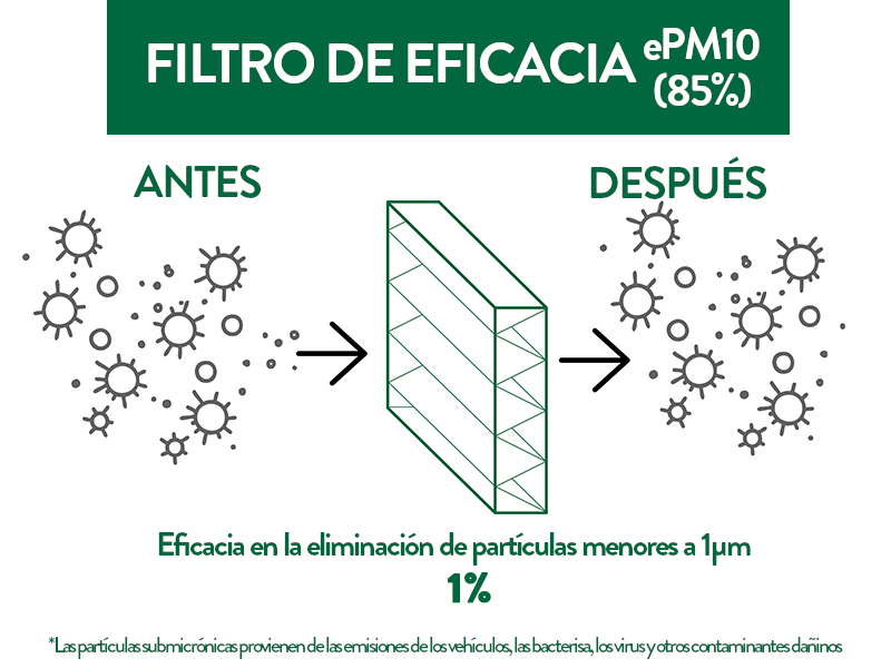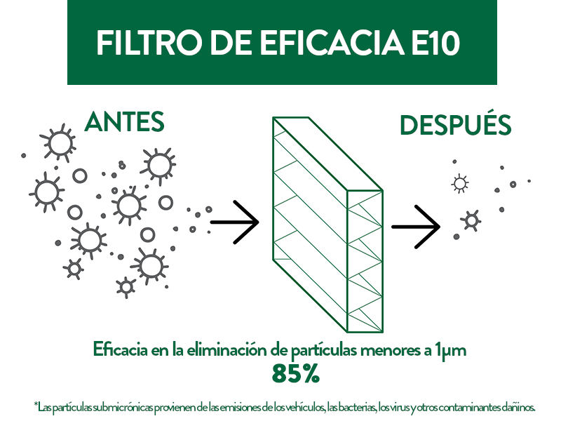 Los estudios sobre la COVID-19 indican que el virus no sobrevive más de 3 días en superficies abiertas. Los siguientes diagramas explicarán la eficacia del filtro de aire seleccionado en la lucha contra las partículas submicrónicas como las emisiones de los vehículos, las bacterias, los virus y otros contaminantes dañinos.