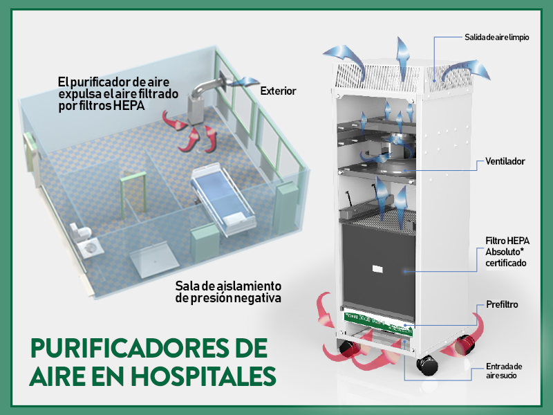 En los hospitales y centros de salud, las habitaciones de aislamiento están diseñadas para contener la propagación de los patógenos de los pacientes infectados. La presión del aire dentro del área de aislamiento es negativa en relación con las habitaciones adyacentes. Esto evita que el aire, que puede contener virus peligrosos, salga de la habitación a través de puertas y ventanas abiertas, o incluso a través de grietas invisibles en la pared, ya que está bloqueado por la elevada presión del aire fuera de la habitación. Los hospitales tienen una capacidad limitada de salas de aislamiento que pueden verse rápidamente desbordadas por un número cada vez mayor de casos. Los purificadores de aire proporcionan a los centros de salud una pieza clave del equipo necesario para convertir las habitaciones habituales en unidades de aislamiento.
