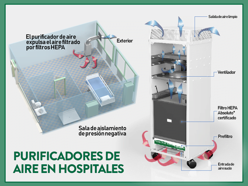 En los hospitales y centros de salud, las habitaciones de aislamiento están diseñadas para contener la propagación de los patógenos de los pacientes infectados. La presión del aire dentro del área de aislamiento es negativa en relación con las habitaciones adyacentes. Esto evita que el aire, que puede contener virus peligrosos, salga de la habitación a través de puertas y ventanas abiertas, o incluso a través de grietas invisibles en la pared, ya que está bloqueado por la elevada presión del aire fuera de la habitación. Los hospitales tienen una capacidad limitada de salas de aislamiento que pueden verse rápidamente desbordadas por un número cada vez mayor de casos. Los purificadores de aire proporcionan a los centros de salud una pieza clave del equipo necesario para convertir las habitaciones habituales en unidades de aislamiento.