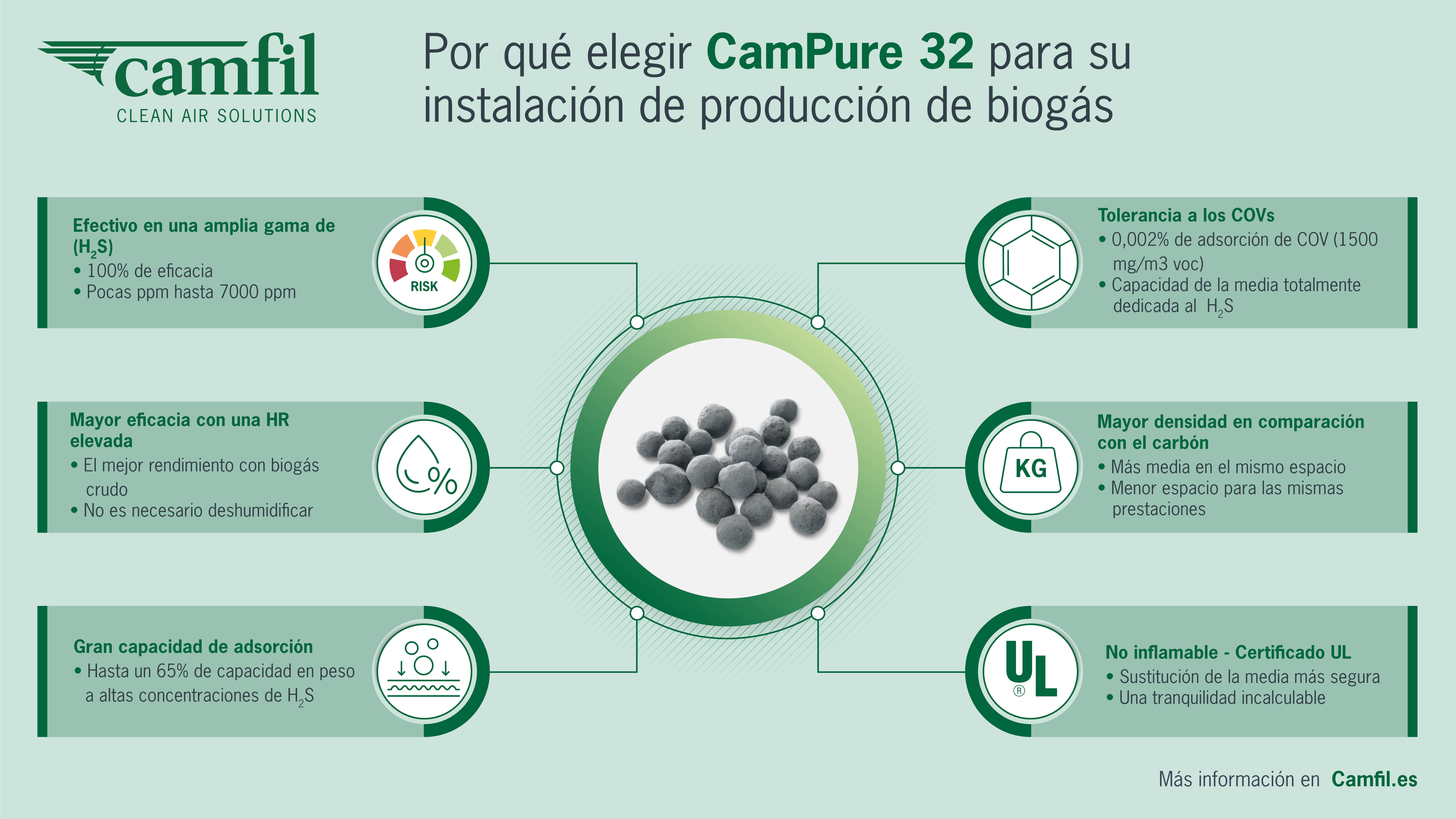Camfil ofrece al mercado una media rentable para la eliminación del sulfuro de hidrógeno generado durante la producción de biogás por digestión anaeróbica: CamPure 32. Este adsorbente químico de alta calidad es una combinación de adsorbentes, tratados mediante un sistema de impregnación química específico. Esta media tiene un menor contenido de polvo en comparación con el carbón clásico y también presenta una vida útil más larga. CamPure 32 está certificado según la norma UL 900. Sus características de baja inflamabilidad lo convierten en un medio mucho más seguro que el carbón. Esta es una característica importante para su uso en un entorno en el que la ignición de los lechos de materiales adsorbentes es un riesgo real, por ejemplo, la producción de biogás.