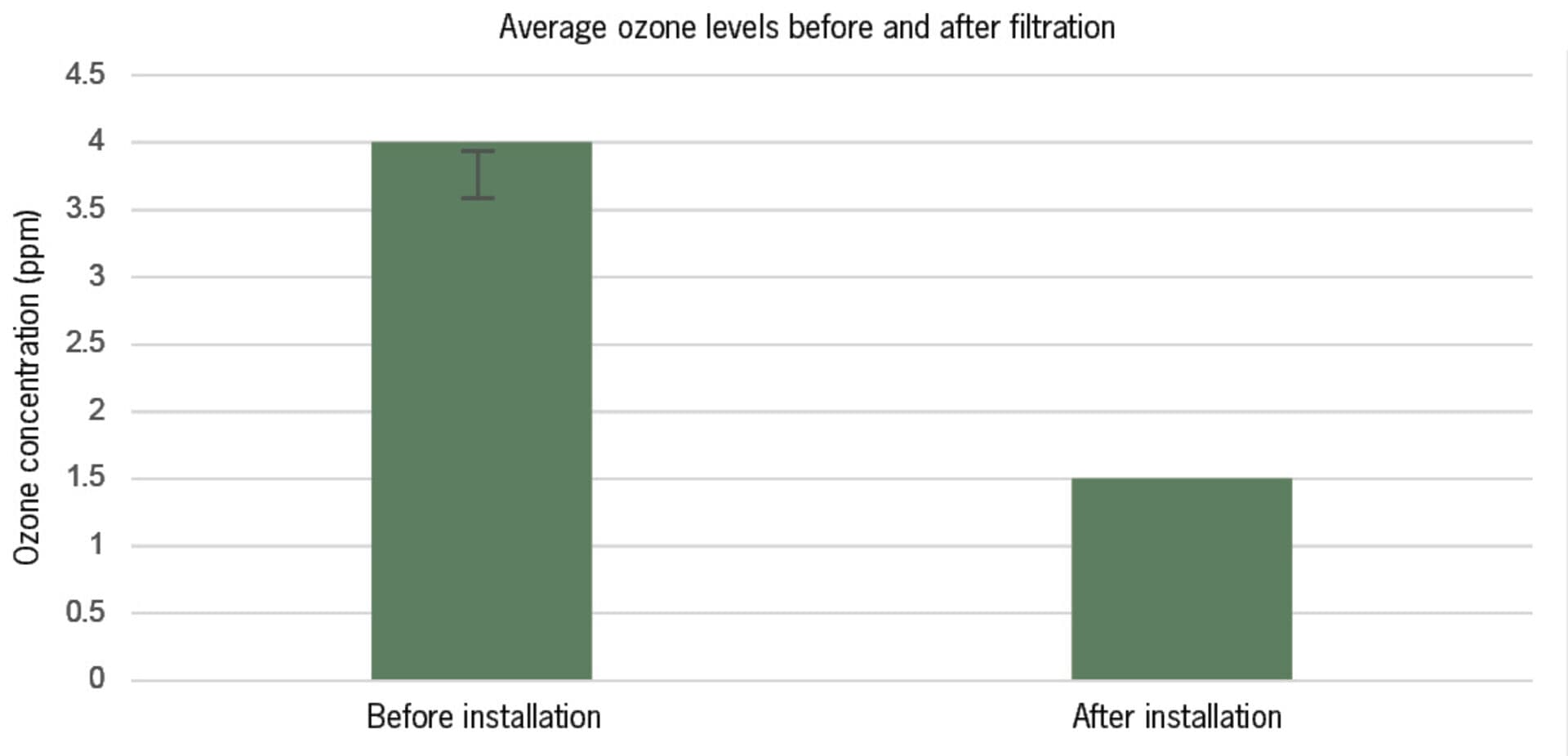 El anexo B ilustra la reducción de la concentración de ozono lograda tras la implementación del sistema. Sin filtración, los niveles alcanzaban hasta 4 ppm. Con la filtración, los niveles se estabilizaron en 1,5 ppm, lo que demuestra la capacidad del sistema para mantener una calidad del aire constante y proteger los componentes críticos de la degradación relacionada con el ozono.