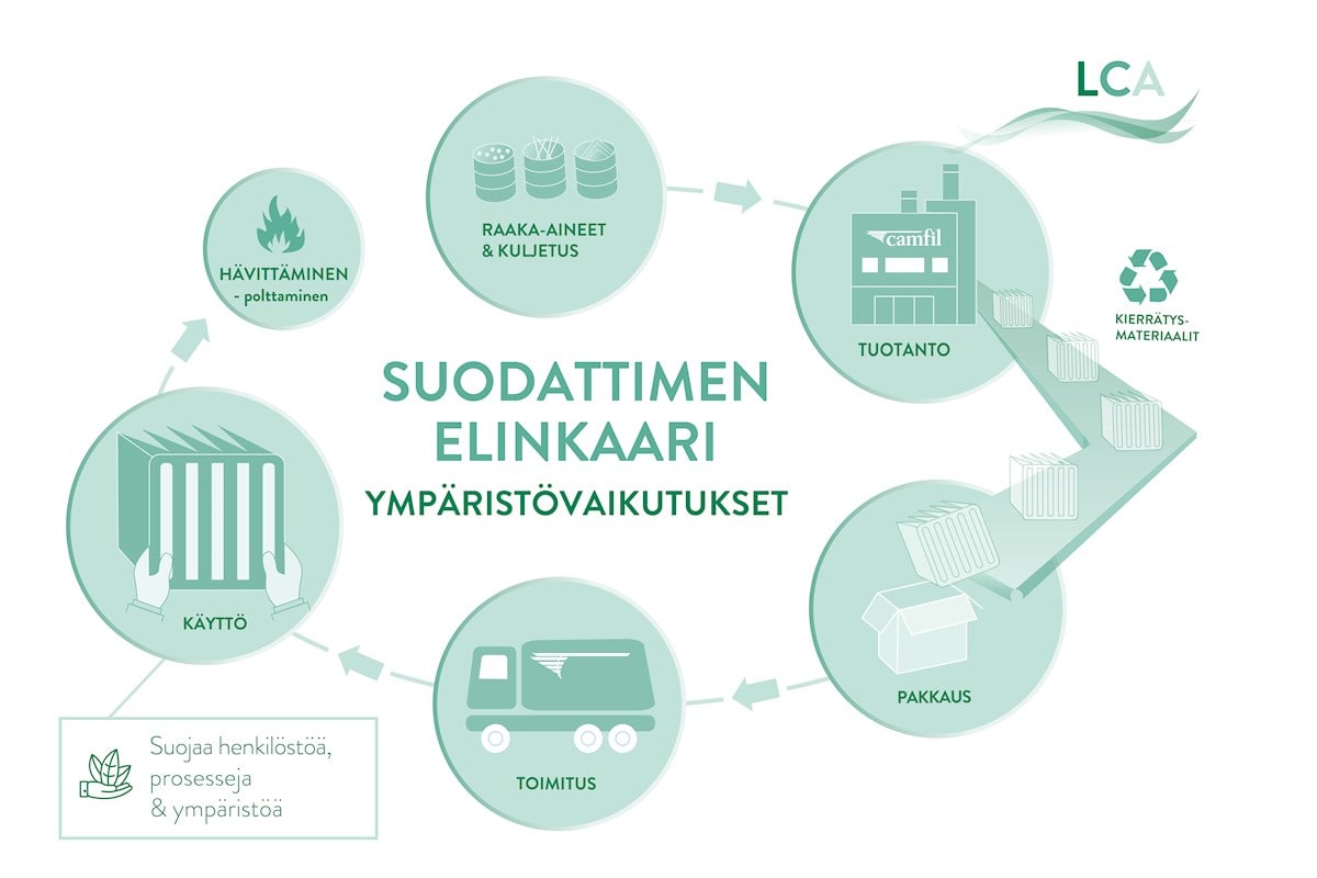 Tuotteidemme ja palvelujemme jatkuvan kehittämisen kannalta on tärkeää tietää, minkälaiset yrityksemme ympäristövaikutukset ovat tänä päivänä. Tieto ei ainoastaan auta meitä kehittymään, vaan yhä useammat asiakkaistamme kaipaavat tietoa käyttämiensä tuotteiden ympäristövaikutuksista. Suurin osa muovikehystuotteistamme valmistetaan tehtaallamme Ruotsissa, Trosassa, josta ne toimitetaan meille Suomeen. Camfil Svenska Ab on Ruotsin ympäristökeskuksen avulla laatinut elinkaariarviointeja (LCA) eri pussisuodattimille, jotka ovat suosittuja tuotteita myös Suomessa. Elinkaariarviointi on menetelmä, jota käytetään tuotteen ympäristövaikutusten arvioinnissa.