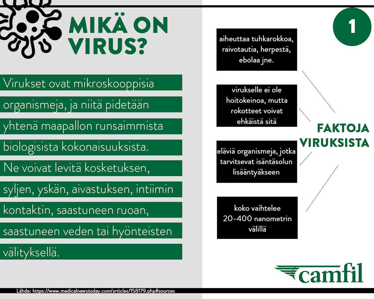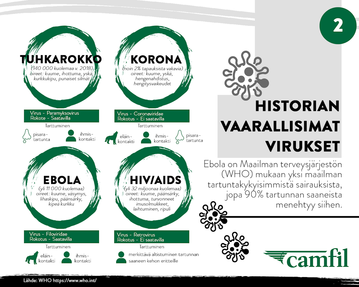 Hyvän hygieniatason ylläpitäminen ja suun peittäminen hengityssuojaimella ovat hyviä keinoja suojautua liiallisia epäpuhtauksia vastaan. Riittääkö tämä? Joitakin viruksia vastaan voidaan suojatua rokotteilla, toisia ei. Virukset, joita vastaan ei ole löytynyt toimivia rokotteita, ovat vaikeammin hallittavissa. Mikäli virus on herkästi tarttuva sekä henkeä uhkaava, voi siitä muodostua vakava pandemia. WHO (Maailman terveysjärjestö) on julistanut globaaleja hätätiloja useita kertoja historiassa vaarallisen, henkeä uhkaavan virustartunnan takia. Helmikuussa 2003 vakavaan, akuuttiin hengitystieoireyhtymään (SARS) menehtyi noin yksi kymmenestä sairastuneesta ihmisestä. Ebolavirukseen on menehtynyt 40 vuoden aikana 40 - 90% tartunnan saaneista. Merkittäväksi pandempiaksi vuonna 2019 noussut koronavirus on tartuttanut 40 000 ihmistä ja määrä on kasvussa.