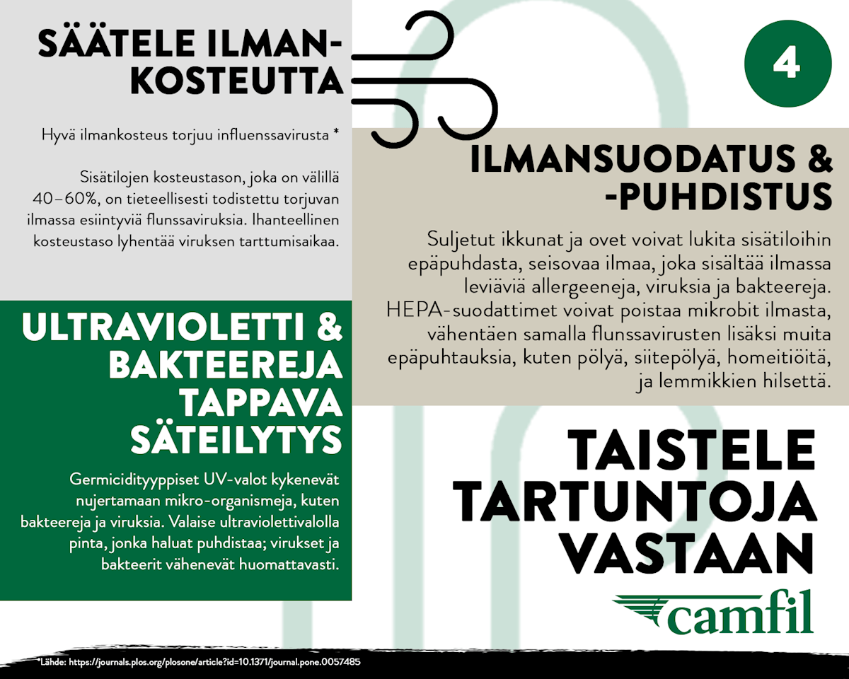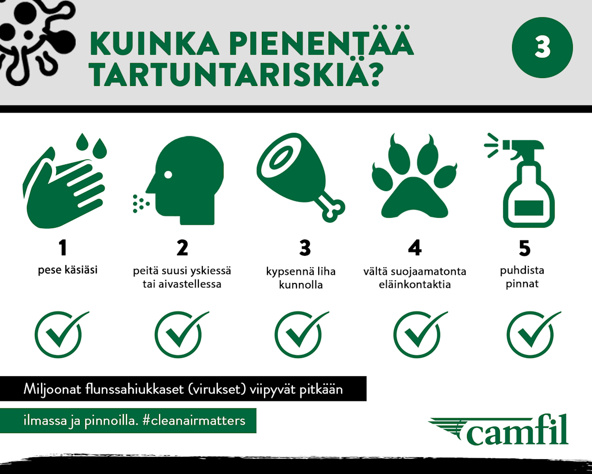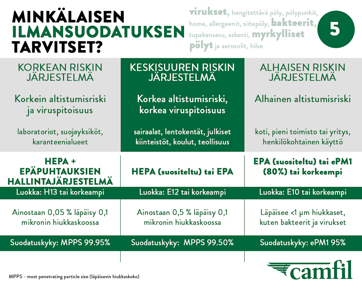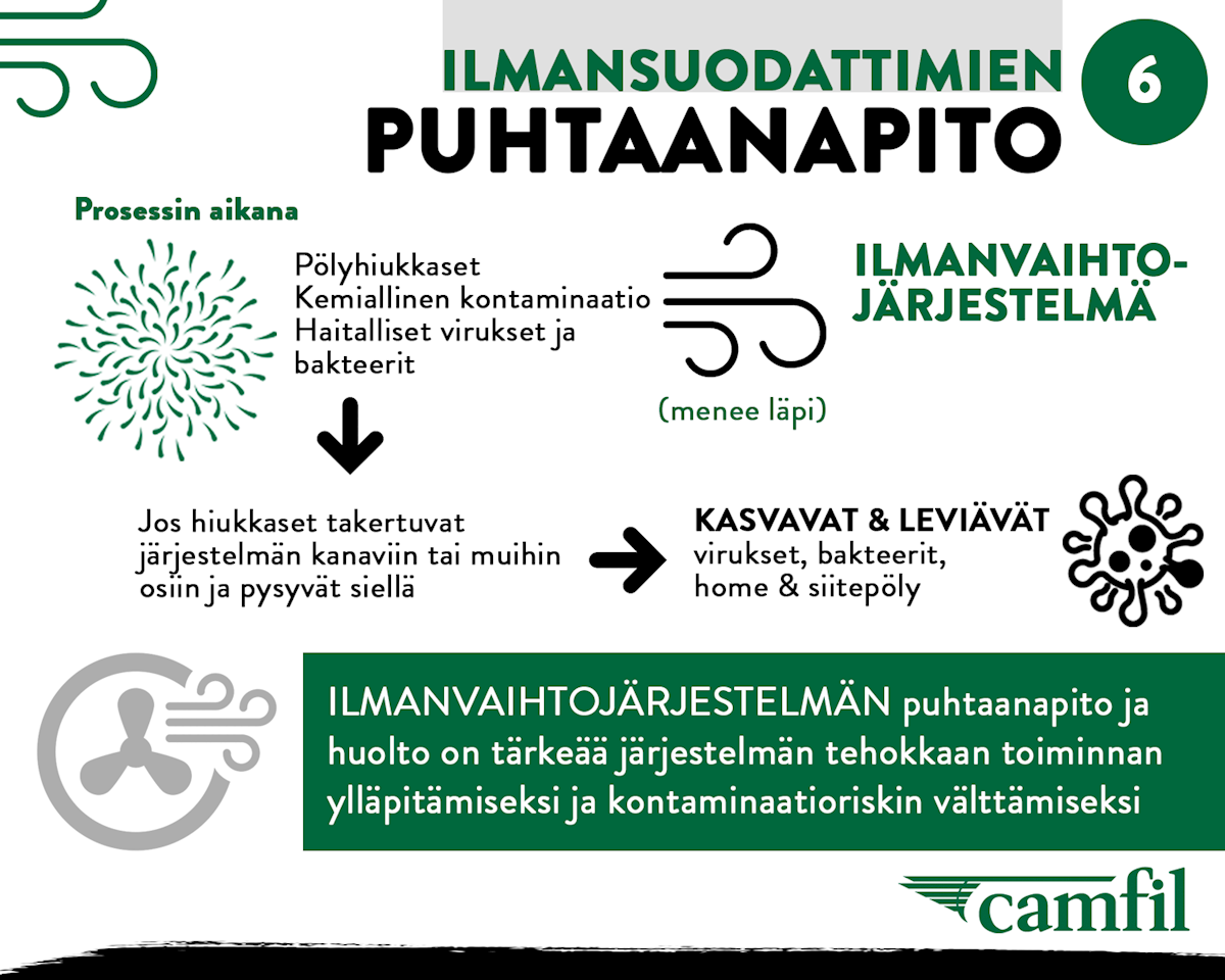 Ilmanvaihtojärjestelmien suodatusyksikkö poistaa ilmasta pölyhiukkaset, kemialliset epäpuhtaudet, haitalliset virukset ja bakteerit sekä muut myrkylliset hiukkaset. Mutta mihin ne menevät? Osa epäpuhtauksista takertuu suodattimien osiin tai laitteen kanaviin, mistä voi seurata vakavia terveysriskejä. Tukosten välttämiseksi ilmanvaihtojärjestelmän puhdistaminen ja ylläpito on tärkeää. Puhdas järjestelmä hygieenisissä työolosuhteissa auttaa poistamaan terveydelle vaaralliset hiukkaset ilmasta. Mikäli tartunta kuitenkin pääsee leviämään kiinteistössä, on syytä ensin tutkia, ovatko suodattimet vanhoja ja onko niihin päässyt kerääntymään likaa (esim. orgaanista materiaalia, joka edistää homeen kasvua). On suositeltavaa vaihtaa suodattimet tällaisessa tapauksessa heti uusiin ja samalla pohtia mahdollisuutta päivittää myös suodatusluokkaa. Tiivisteet olisi myös hyvä tarkistaa, jotta vältetään ohivuodot. Laitteesta ja sen toiminnallisuuksista riippuen, ammattilainen voi tehdä sen eri tavoin. Kriittisimmissä ja riskialttiimmissa järjestelmissä käytetään bag-in & bag-out -tekniikkaa, jonka suorittaa asiantuntija, tartuntavaaran vuoksi. Camfilin puhdasilmaratkaisut auttavat poistamaan ilmateitse leviäviä epäpuhtauksia biotieteiden ja mikrobiologian aloilla.