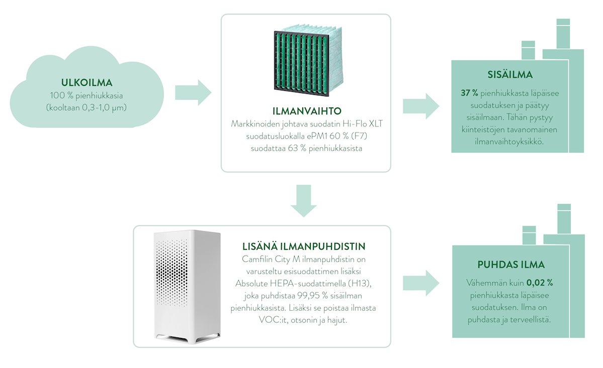 Koneellista ilmanvaihtoa voi tehostaa myös ilmanpuhdistimilla, jotka poistavat sisäilmasta pienimmätkin hiukkaset, sekä VOC:it, otsonin ja hajut, tehden ilmasta puhdasta ja tervellistä. Ilmanpuhdistimet ovat kustannustehokas lisä ilmanvaihtoon, ilman että olemassa olevaan ilmanvaihtokoneeseen. tarvii tehdä muutoksia.