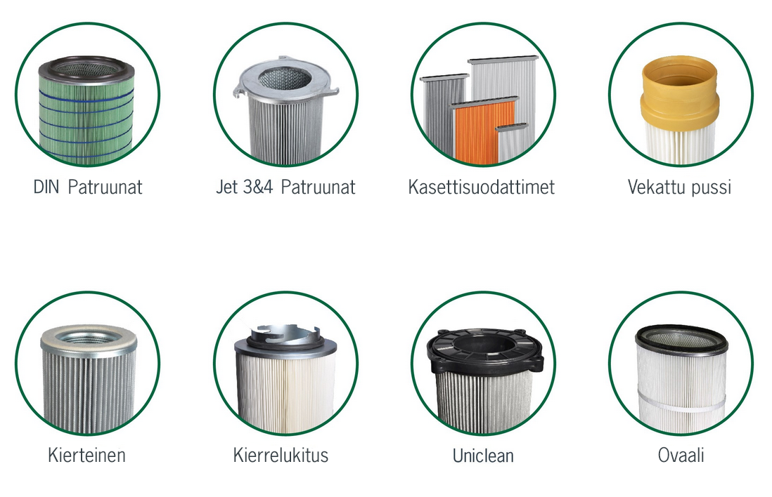 Tiesitkö, että meiltä löytyy laaja valikoima korkealaatuisia suodatinpatruunoita ja kasettisuodattimia, jotka voidaan jälkiasentaa markkinoiden yleisimpiin pölynpoistojärjestelmiin? Jälkiasennettavat suodattimet takaavat optimaalisen suorituskyvyn pölynhallintajärjestelmällesi ja säästät huoltokustannuksissa.
