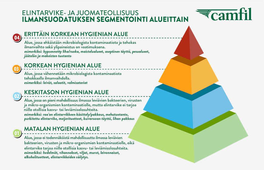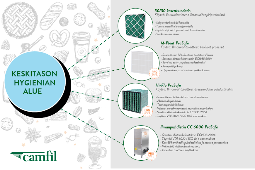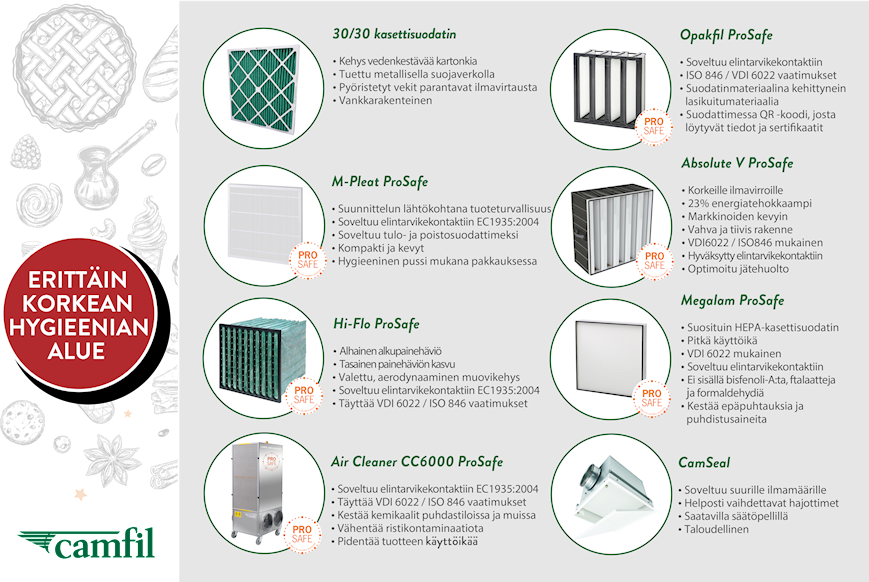 Camfil toimii yhteistyössä maailman suurimpien elintarvike- ja juomateollisuuden yritysten kanssa. Olipa kyseessä pandemian riskien ennaltaehkäisy, elintarviketurvallisuus, korkeiden standardien ylläpito, lämpötilan tasaaminen tai mikä tahansa ilmanlaatuhaaste, me autamme sinua. Käytämme tuotteissamme edistyneintä suodatustekniikkaa, jonka ansiosta tuotteemme todella suojelevat ihmisiä, prosesseja ja ympäristöä.