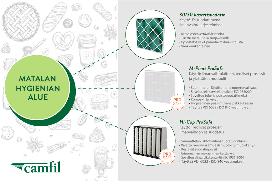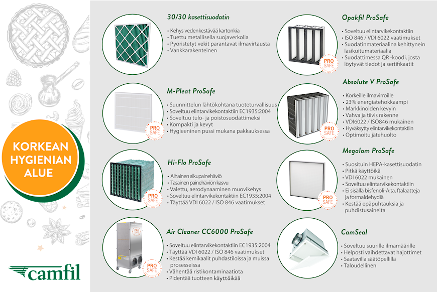 Tarjoamme elintarvike- ja juomateollisuudelle täyden valikoiman ProSafe-suodattimia - jotka on erityisesti suunniteltu prosesseille, joilla on tiukat turvallisuus-, jäljitettävyys- ja valvontavaatimukset.