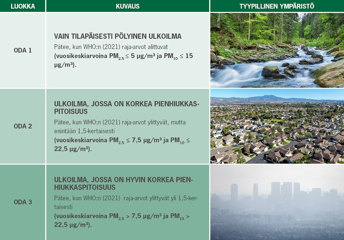 Ulkoilman laatu määritellään WHO:n ilmanlaatua koskevien määräysten perusteella. Kun tiedät mihin ulkoilmanlaatuluokkaan rakennuksesi sijaintinsa perusteella kuuluu, voit tarkastaa yksinkertaiset ohjeet kiinteistössä tarvittavan suodatuksen tasosta. Alueilla, joilla ODA-arvo on alhainen, on suodatuksen vähimmäisvaatimustaso alhainen. Monet nettisivut, kuten Ilmatieteen laitos, tarjoavat reaaliaikaisia ilmanlaatulukemia eri paikkakunnilta.