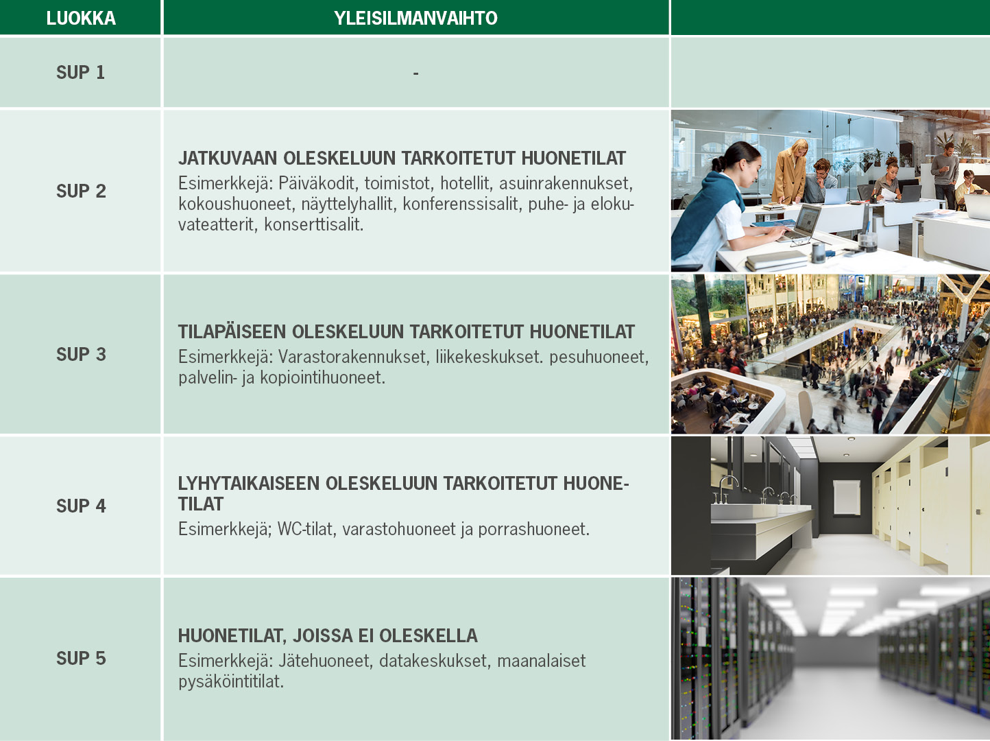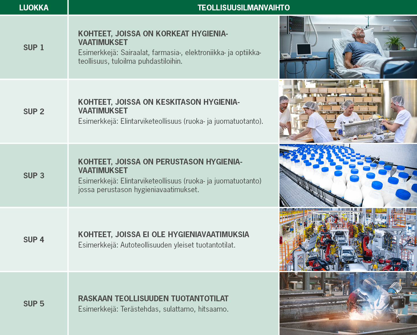 Rakennuksen tuloilmavaatimukset määräytyvät rakennuksen tyypin ja rakennuksessa harjoitettavan toiminnan perusteella. Eurovent 4/23 tuloilmaoppaan avulla voit määrittää rakennuksen vaatimukset viiden keskeisen luokan perusteella, kuten alla olevassa kuvassa on esitetty.