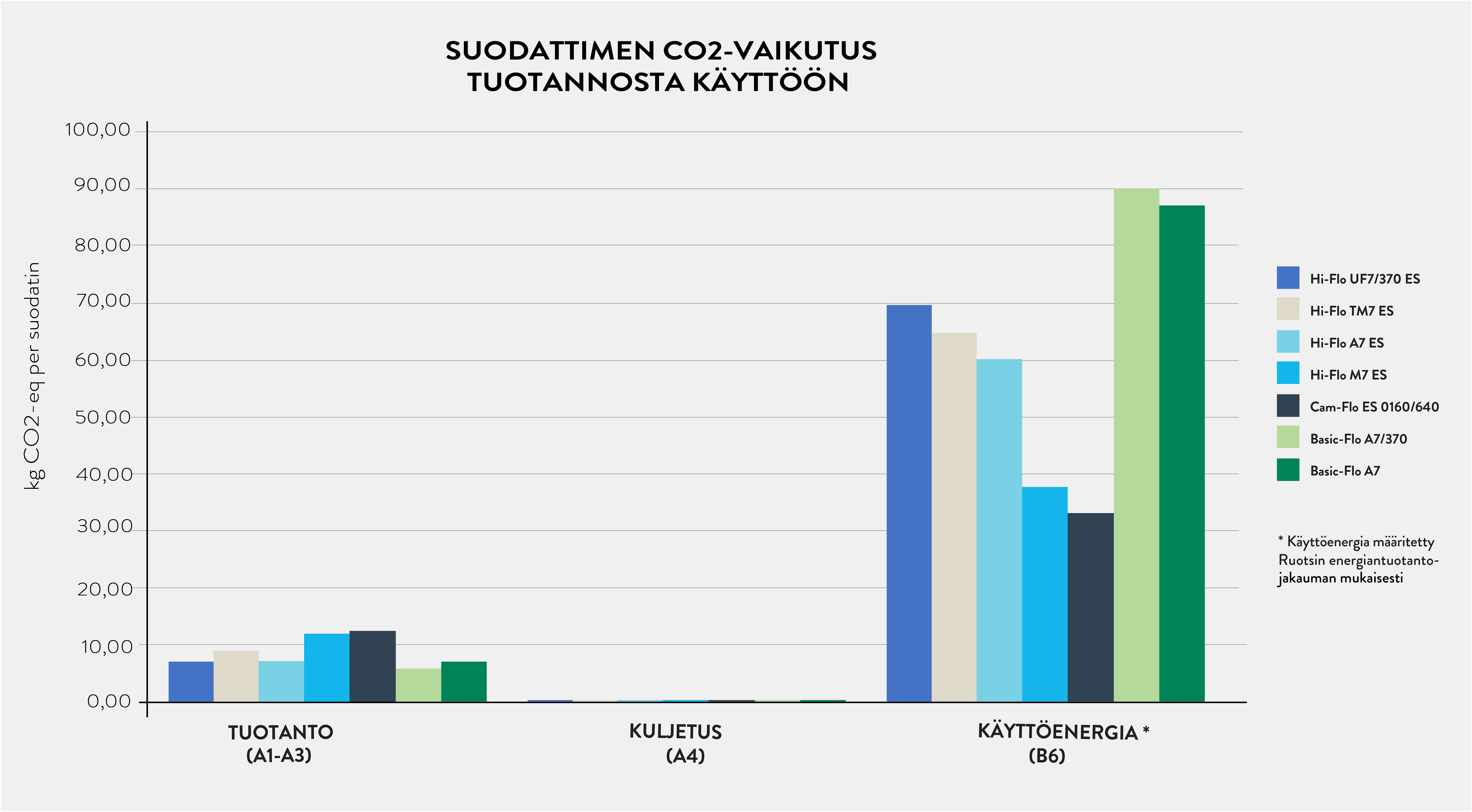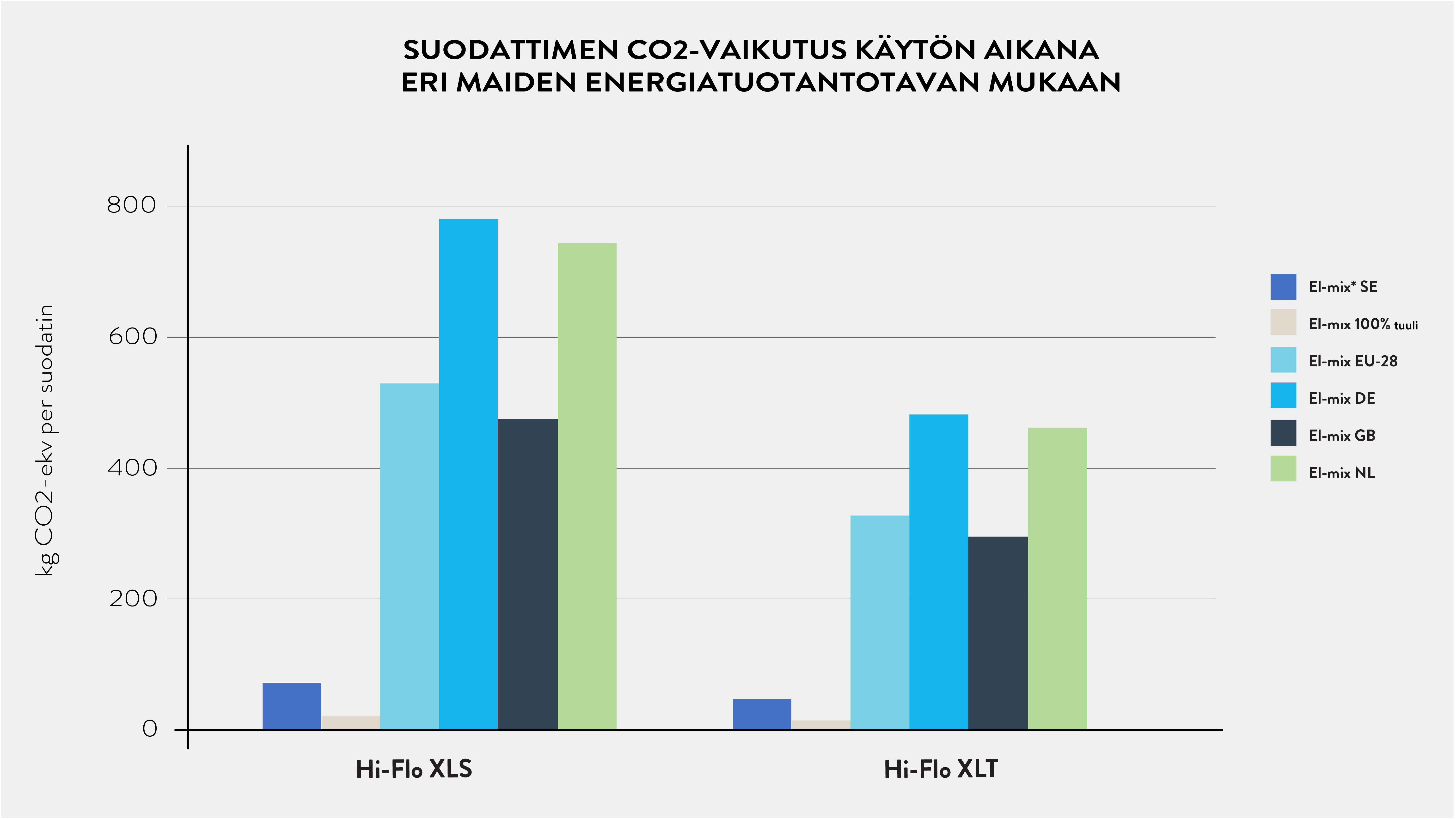 Kaavio osoittaa suodattimien käytönaikaisen CO2-vaikutuksen eri maiden sähköntuotantojakauman mukaan, johon vaikuttaa se kuinka sähköenergia eri maissa tuotetaan. Pohjois- ja Keski-Euroopan energiatuotanto koostuu pääosin fossiilisista polttoaineista, puupolttoaineista sekä ydin-, vesi- ja tuulivoimasta, mutta niiden käyttöjen suhteet vaihtelevat eri maiden välillä.
