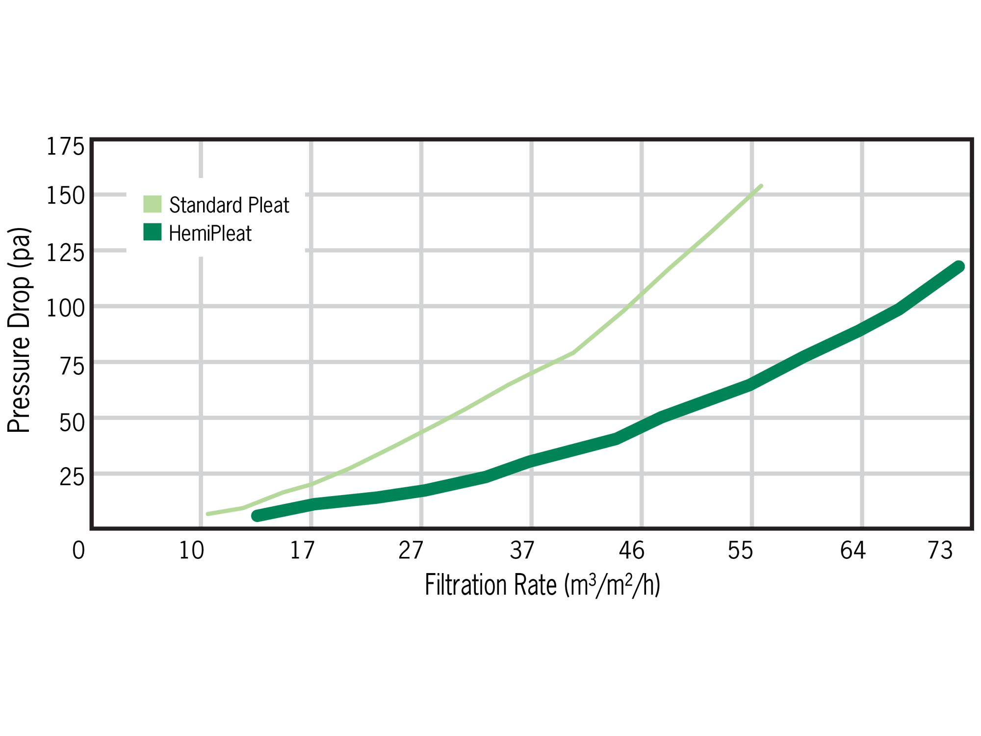 La technologie HemiPleat offre la perte de charge initiale la plus faible et la perte de charge moyenne la plus faible pendant toute la durée de vie du filtre.