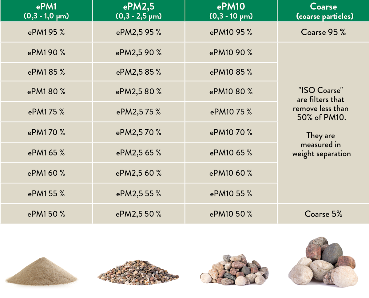 La précédente norme EN 779 classait les filtres à air de G1 à F9 et les classes d'efficacité de M5 à F9 s’appuyaient sur une taille moyenne de particules de 0,4 µm (micromètres). La norme ISO 16890 définit l’efficacité de la filtration pour 3 plages de taille de particules : PM1 (0,3-1,0 µm), PM2,5 (0,3-2,5 µm) et PM10 (0,3-10 µm). Le filtre se voit alors attribuer une classe d’efficacité dans l'un de ces trois groupes ou alors il est classé comme Grossier (filtre grossier).