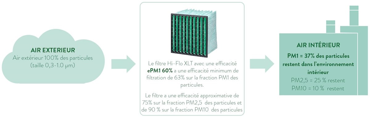 Le filtre arrête plus de 50% des particules PM1. Il est donc classé ePM1, le pourcentage est arrondi à 5% (valeur inférieure la plus proche). L’efficacité de filtration est donc : ePM1 60 %.