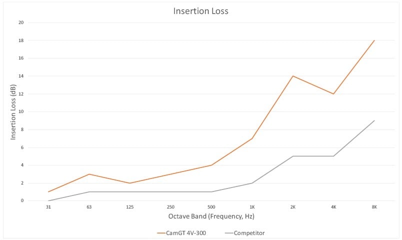 Les ingénieurs en insonorisation de Camfil ont effectué une analyse afin d’expliquer la perte d’insertion sonore des filtres finaux CamGT 4V-300 à efficacité H13 Camfil (conformément à la norme EN1822) à différentes fréquences par rapport aux filtres H13 concurrents. La figure 1 montre que le filtre CamGT 4V-300 a une perte d'insertion sonore plus élevée à toutes les fréquences. De plus, la réduction des nuisances sonores du filtre CamGT est supérieure de 4 dBA à celle du filtre concurrent local. Une augmentation de 3 dBA est égale à deux fois plus de bruit. Une amélioration de 4 dBA signifie que le filtre CamGT est deux fois plus efficace en matière de réduction de bruit audible que le filtre concurrent.