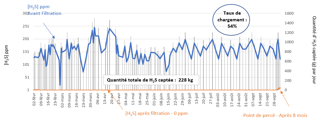 Un essai de CAMPURE 32 a été réalisé début 2019 au sein du Groupement Agricole . Les 500 L de charbon actif du réservoir existant ont été remplacés sans qu’aucune modification ne soit nécessaire. La concentration en H2S à l’entrée, avant filtration, varie entre 150 et 200 ppm. Après filtration celle-ci doit être inférieure à 10 ppm,concentration entrainant une coupure automatique du moteur afin de le protéger des attaques du sulfure d’hydrogène. 4 mois après la mise en place de CAMPURE 32, la concentration en H2S après filtration reste stable à 0 ppm. (Cf graphique)