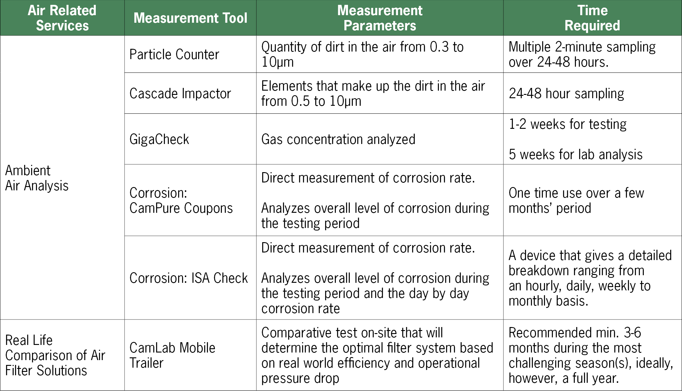 Il est judicieux de protéger vos biens dès le départ et Camfil peut vous aider à mener cette étude préliminaire afin de déterminer la solution la plus appropriée qui générera le plus de bénéfices en fonction de vos conditions et besoins opérationnels spécifiques. Le tableau ci-dessous présente les différents services liés à l’air que propose Camfil :