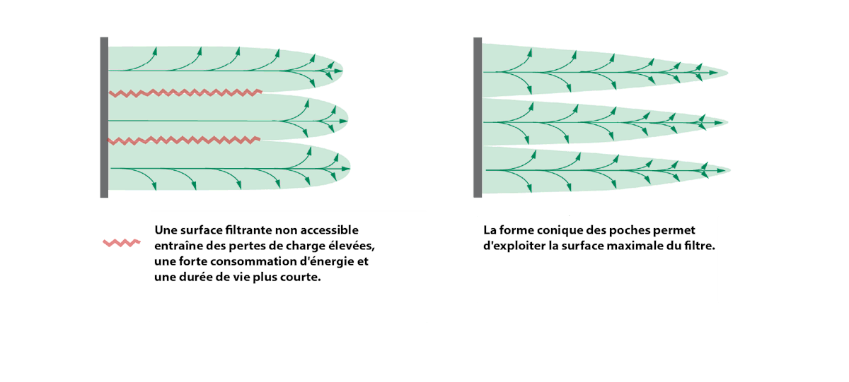 La couture conique à l'intérieur des poches les empêche de se « coller » ensemble lorsqu’elles se gonflent (ce qui réduirait la surface filtrante), favorisant le passage de l’air et réduisant ainsi la consommation d'énergie ; ceci sans compromettre l'efficacité du filtre.