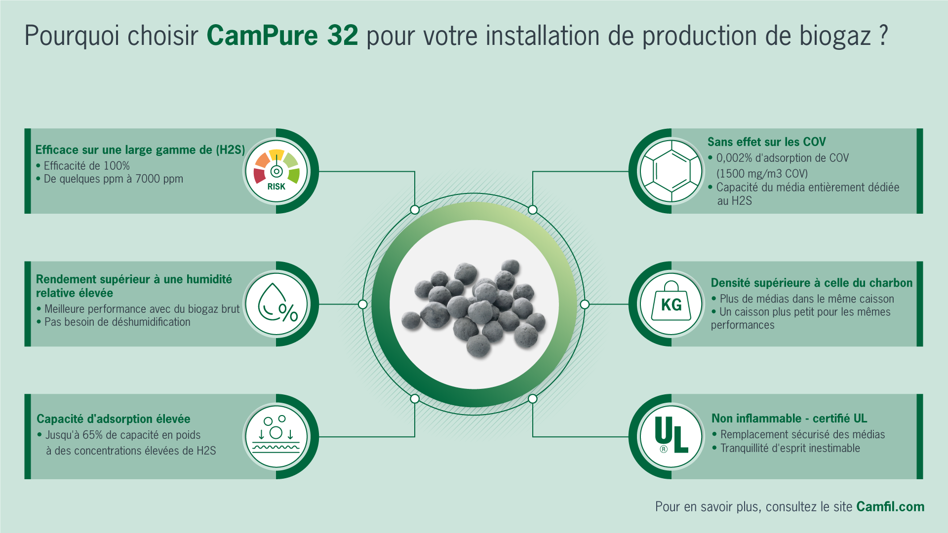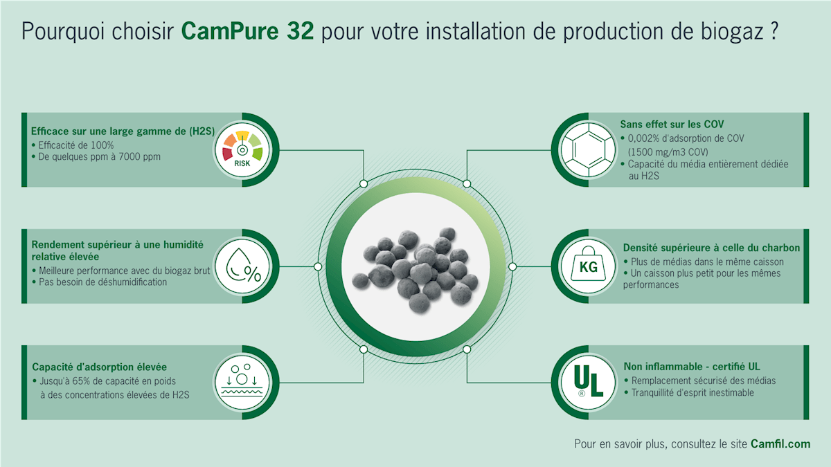 Camfil a mis sur le marché un média rentable pour l'élimination du sulfure d'hydrogène généré lors de la production de biogaz par digestion anaérobie : le CamPure 32. Cet adsorbant chimique de haute qualité est une combinaison d'adsorbants, traités par un système d'imprégnation chimique dédié. Ce média présente une teneur en poussière inférieure à celle du charbon classique et présente également une durée de vie plus longue. CamPure 32 est certifié conforme à la norme UL 900. Ses caractéristiques de faible inflammabilité en font un média beaucoup plus sûr que le charbon. Il s'agit d'une caractéristique importante pour une utilisation dans un environnement où l'inflammation des lits de médias adsorbants constitue un risque réel, par exemple la production de biogaz.